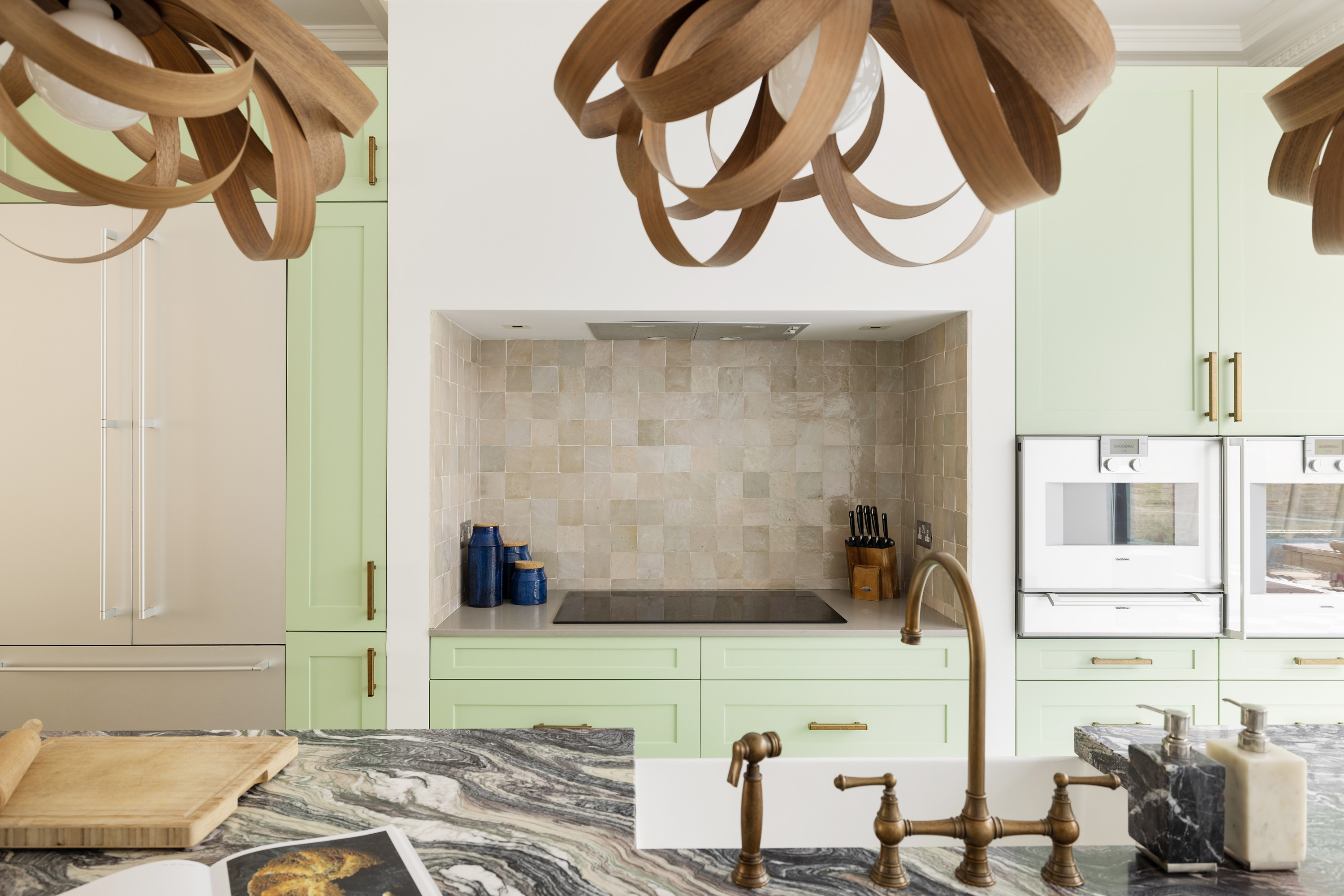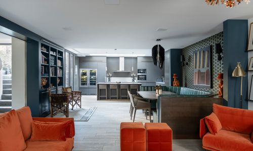 The living area is designed for open plan living and flows into the bespoke fitted kitchen which features a beautiful island with a single slab of Rosso Luana Verde marble worktop. Its unique quality combines rich tones and dramatic luxurious feel to the kitchen design. The kitchen also includes top of the range Gagganau appliances.