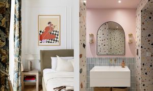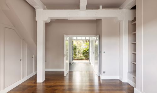 The principal bedroom also enjoys access to the garden through French doors and includes an en-suite wet room featuring wall to floor terrazzo tiles. The recessed bespoke joinery offers discreet but ample storage solution.
