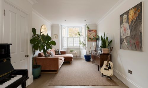 This spacious home, which has recently undergone an elegant refurbishment, provides three bedrooms, a private west facing garden and bespoke kitchen with luxury fittings. The apartment has been thoughtfully crafted to offer expansive entertaining space, ideal for hosting. Accessed through a private front door, which leads into the stylish hallway featuring beautiful House of Hackney wallpaper.