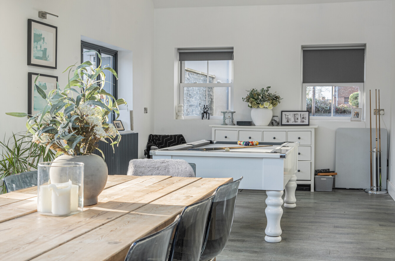 The property’s accommodation is currently arranged over two floors, with flexible layouts to suit a variety of family lifestyles. At the heart of the home, a striking 25’ reception hall, that draws the eye through to the extended kitchen, dining, snug, and games area, creating a flowing space perfect for family gatherings. Three principal reception rooms radiate from the hall, each exquisitely finished to retain the character and elegance of the period, while abundant natural light accentuates their generous proportions. The feature staircase rises gracefully to the first floor, framed by a stunning feature window.