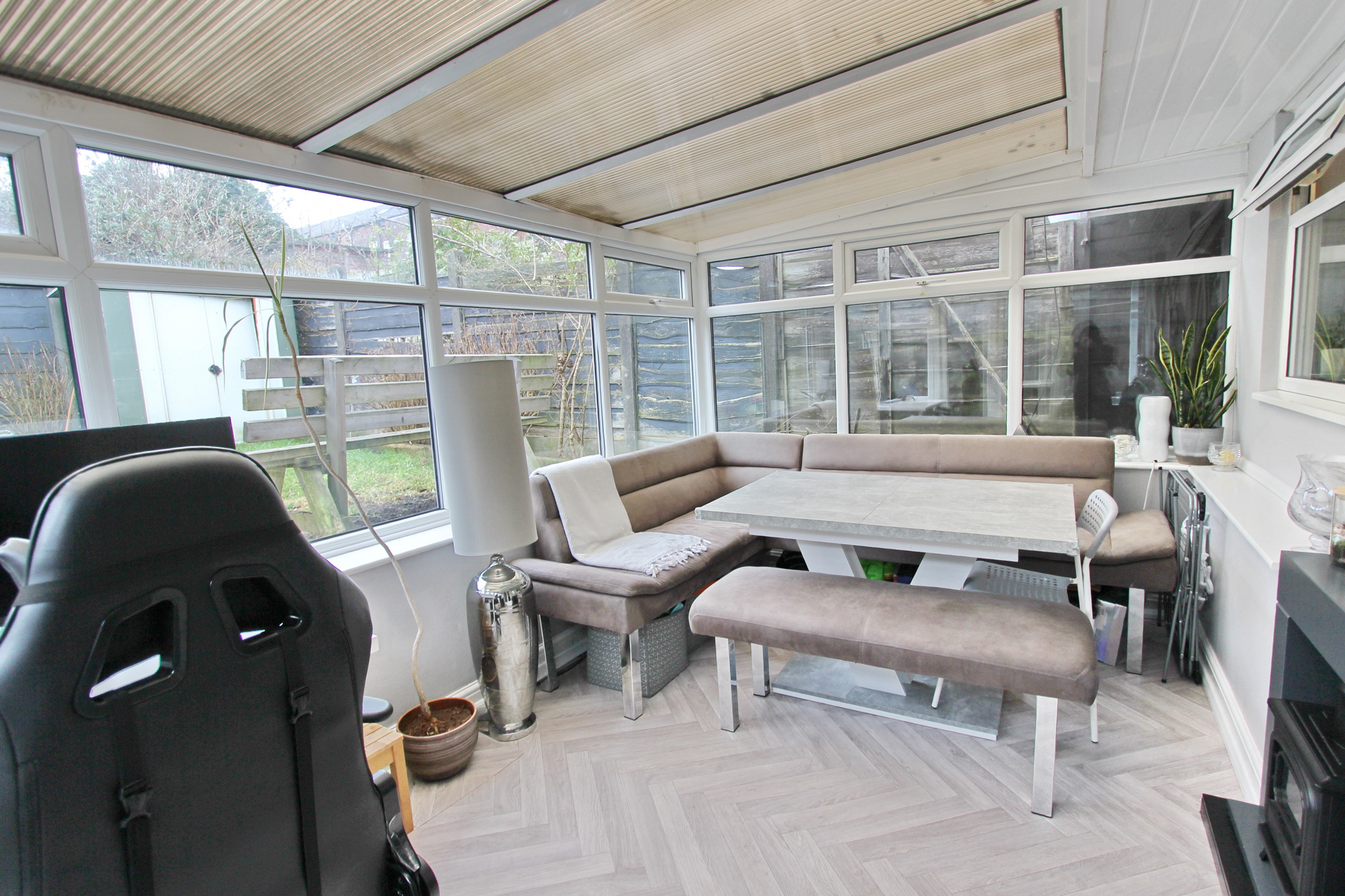 The highlight of this home is the large conservatory, versatile in its purpose as a dining room and office, flooded with natural light and overlooking the garden. Upstairs, three well-appointed bedrooms provide ample accommodation space for a growing family or guests, with a three-piece bathroom suite. Outside, a pebbled driveway ensures convenient off-road parking, while the lawned and decked garden with a shed offers a serene retreat perfect for outdoor gatherings and al fresco dining.