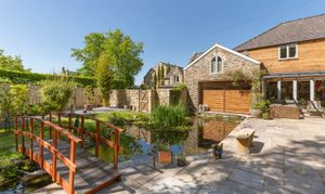 The approach to Birchwood House is via a long, tree-lined driveway that opens into a generous parking area and leads to a large garage. To the front, a large, stone-lined garden is arranged around a stream-fed natural pond, crossed by a small bridge and bordered by mature planting. A broad stone terrace wraps around the house, with a covered seating area strung with ambient lighting — an ideal setting for outdoor dining and entertaining. A secondary courtyard, nestled between the kitchen and garden room, offers a more intimate space for morning coffee or evening drinks.