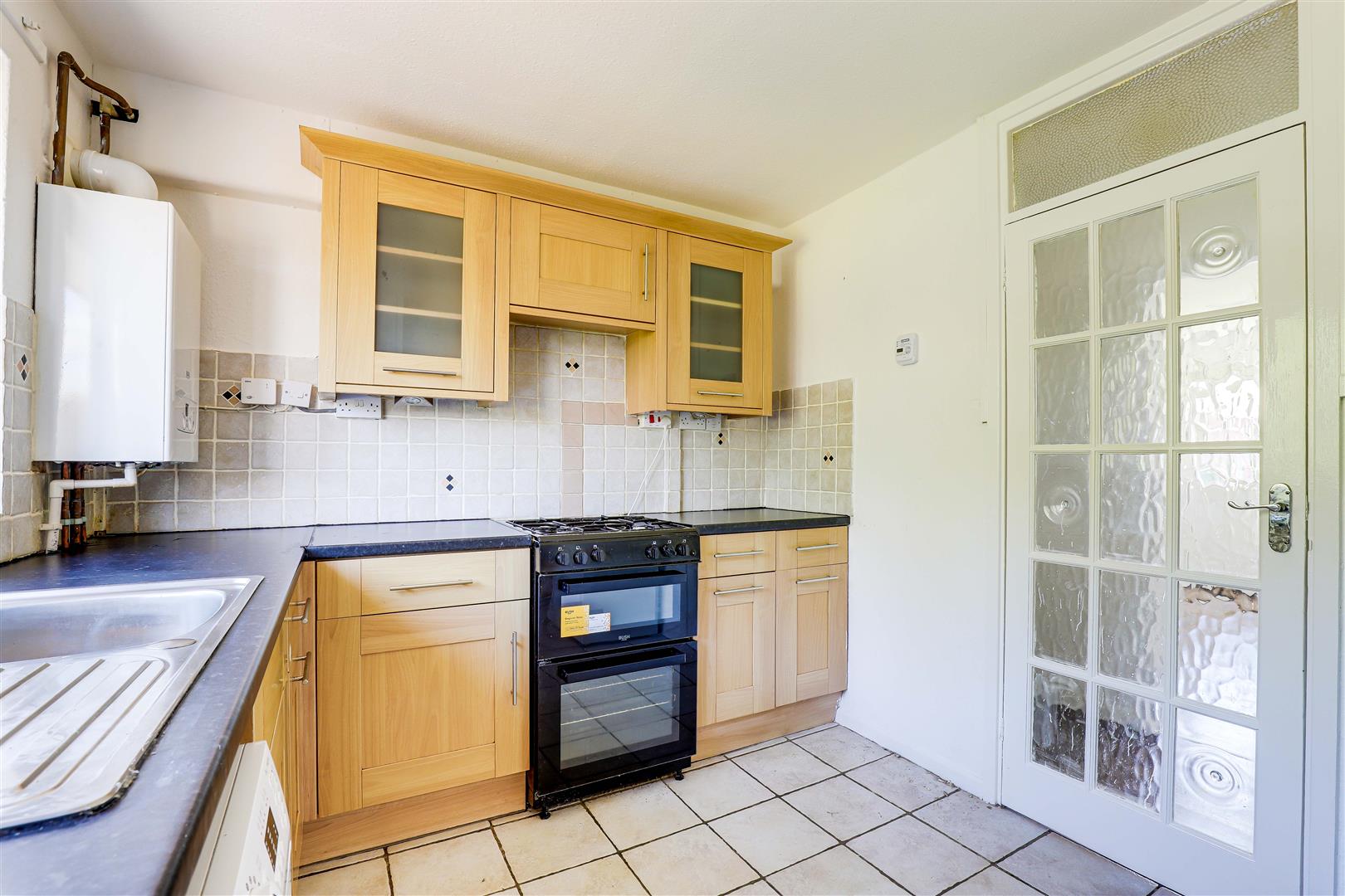 The kitchen has a range of fitted base and wall units with worktops, a stainless steek sink with a mixer tap and drainer, a freestanding cooker, space and plumbing for a washing machine, space for a fridge freezer, an in-built cupboard, tiled splash back, tiled flooring, and a UPVC double glazed window.