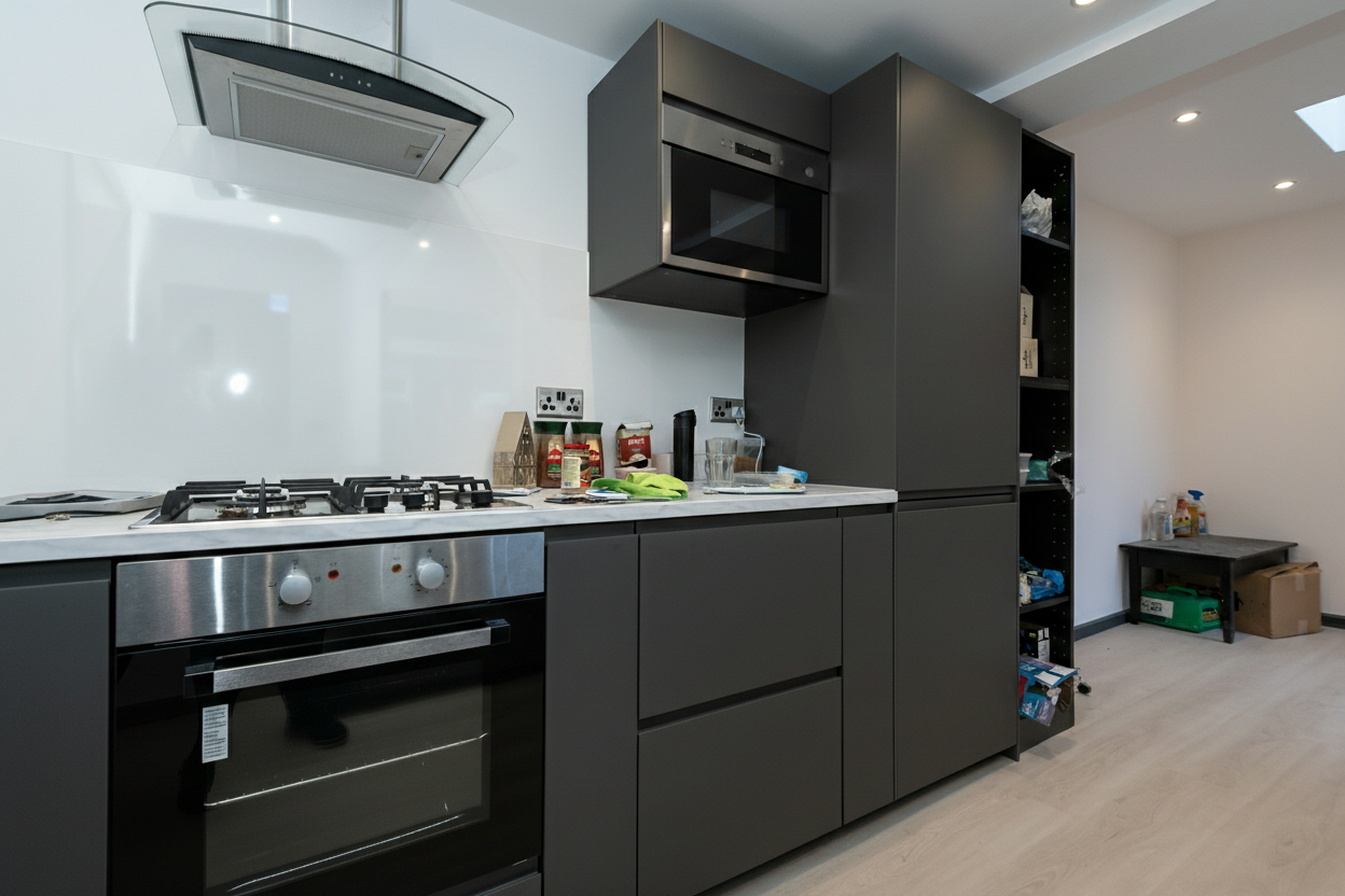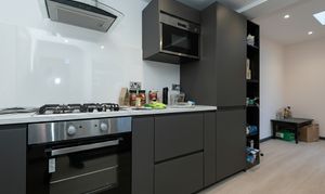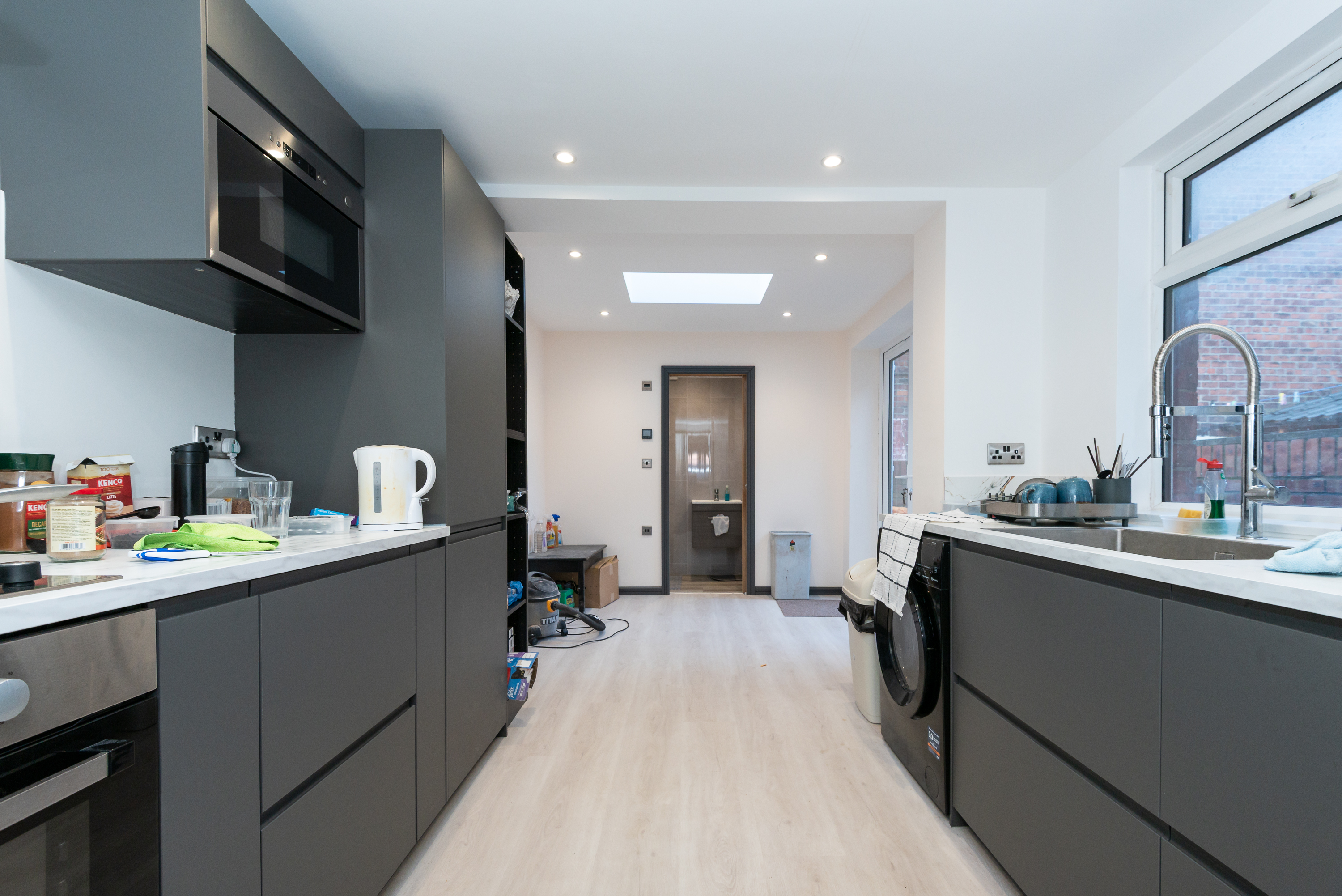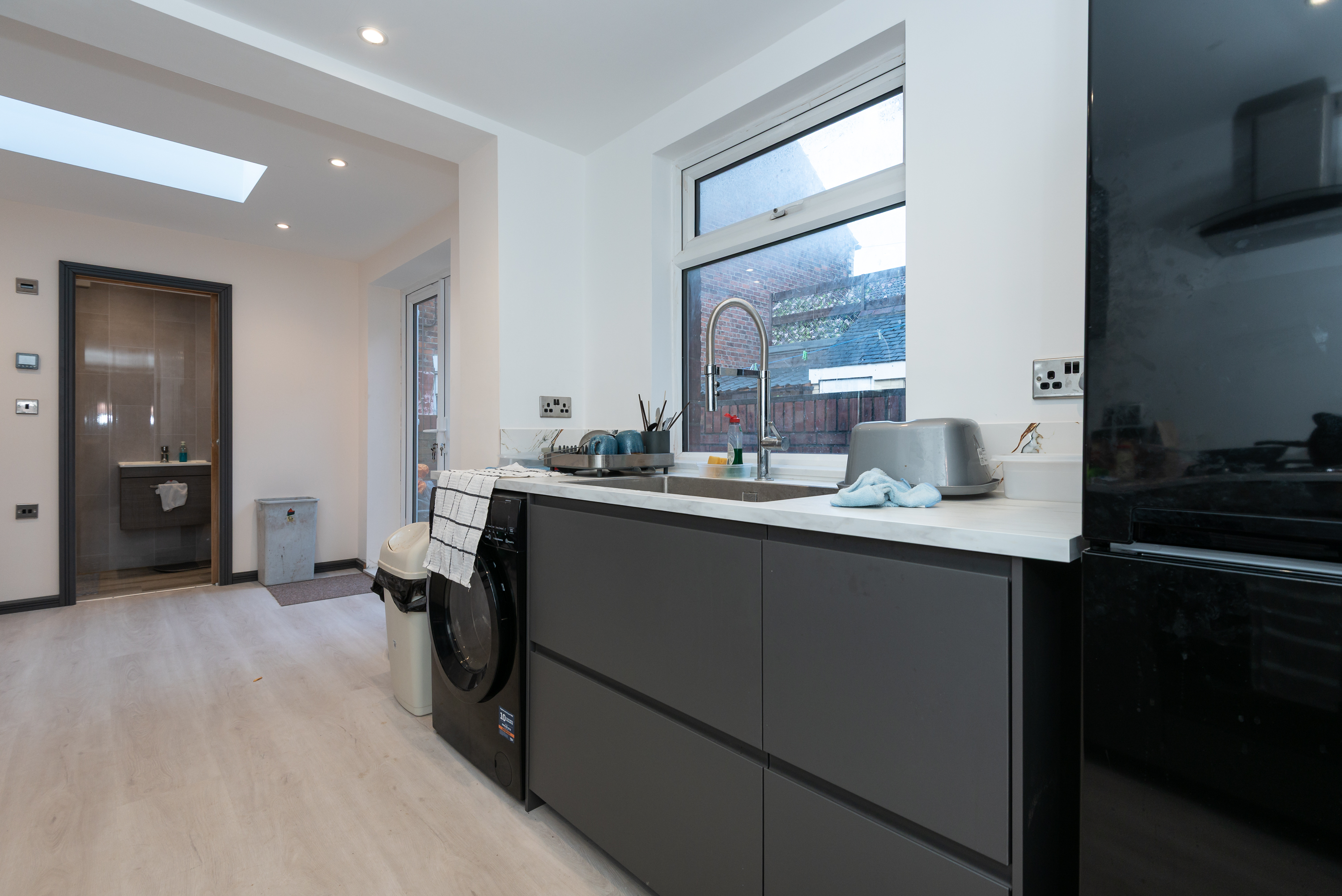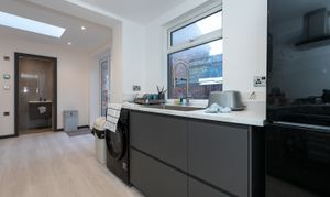 With laminate flooring, handleless units, laminate worktops, integrated gas hob, oven, and microwave, extractor fan, space for fridge freezer, plumbing for washing machine, roof lantern, radiator, and french doors to the rear courtyard.