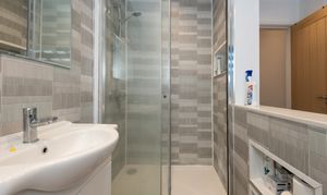 With laminate flooring, tiled surround, shower cubicle, toilet, and wash basin on vanity unit.