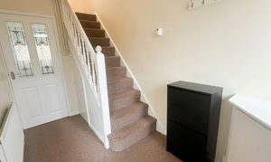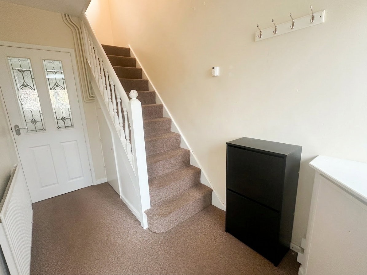 Carpet flooring, UPVC front door, obscured UPVC double glazed window, radiator, metre cupboard, under stairs storage and access into the living room and kitchen.