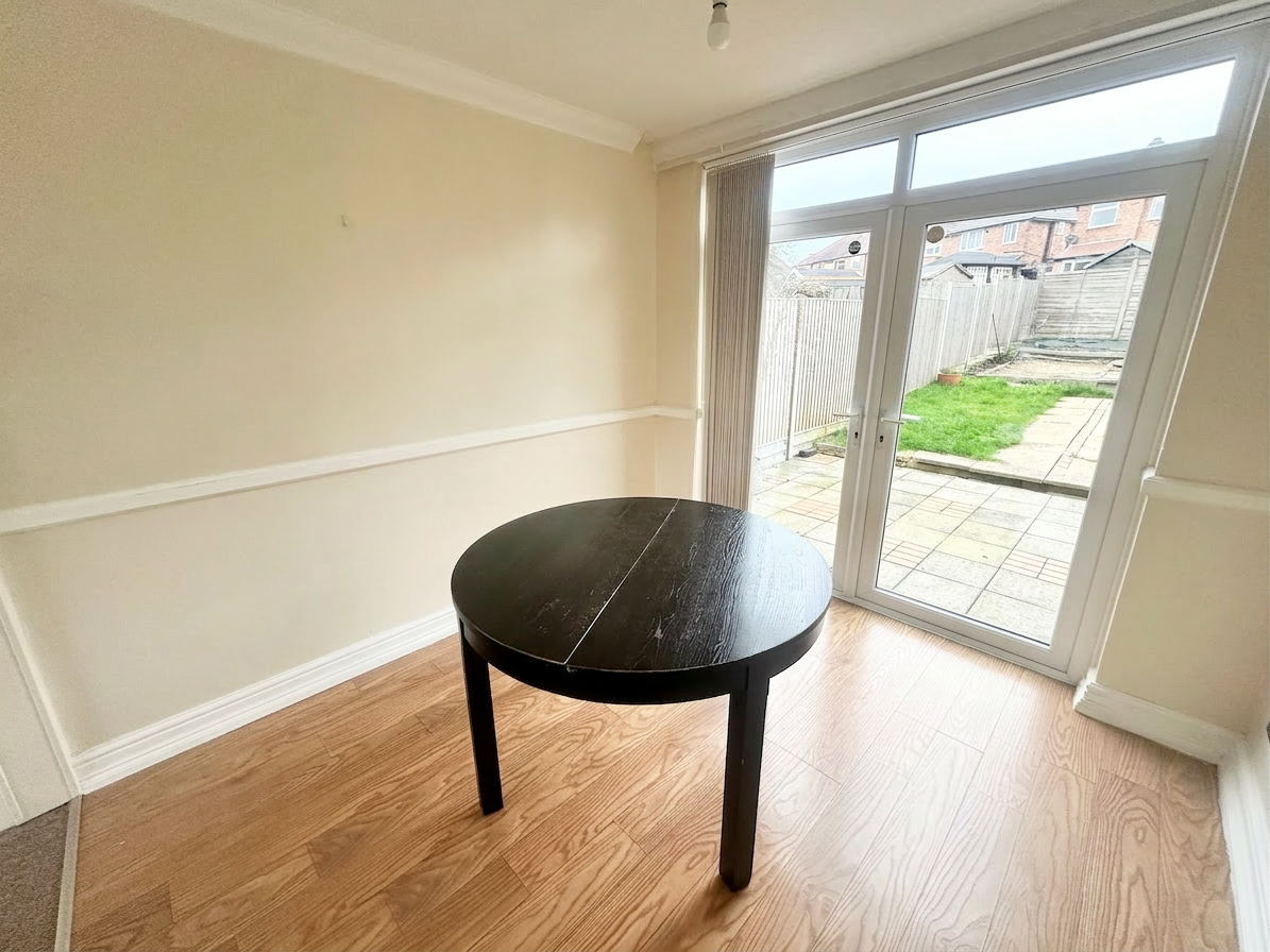 Laminate flooring, radiator and UPVC french double doors for access in to the garden.