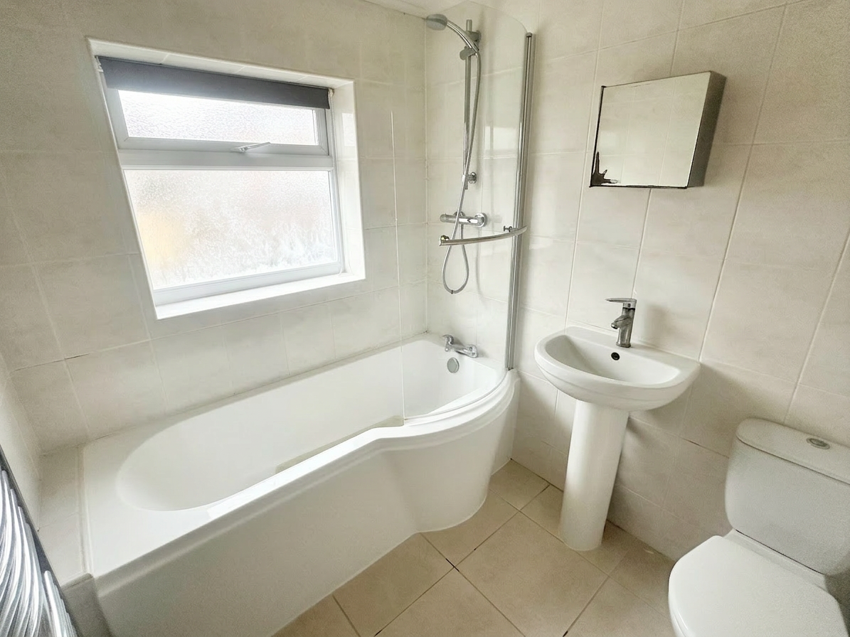 Tiled bathroom, UPVC obscured double glazed window, heated towel rail, bathtub with over the head shower, sink and W.C.