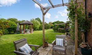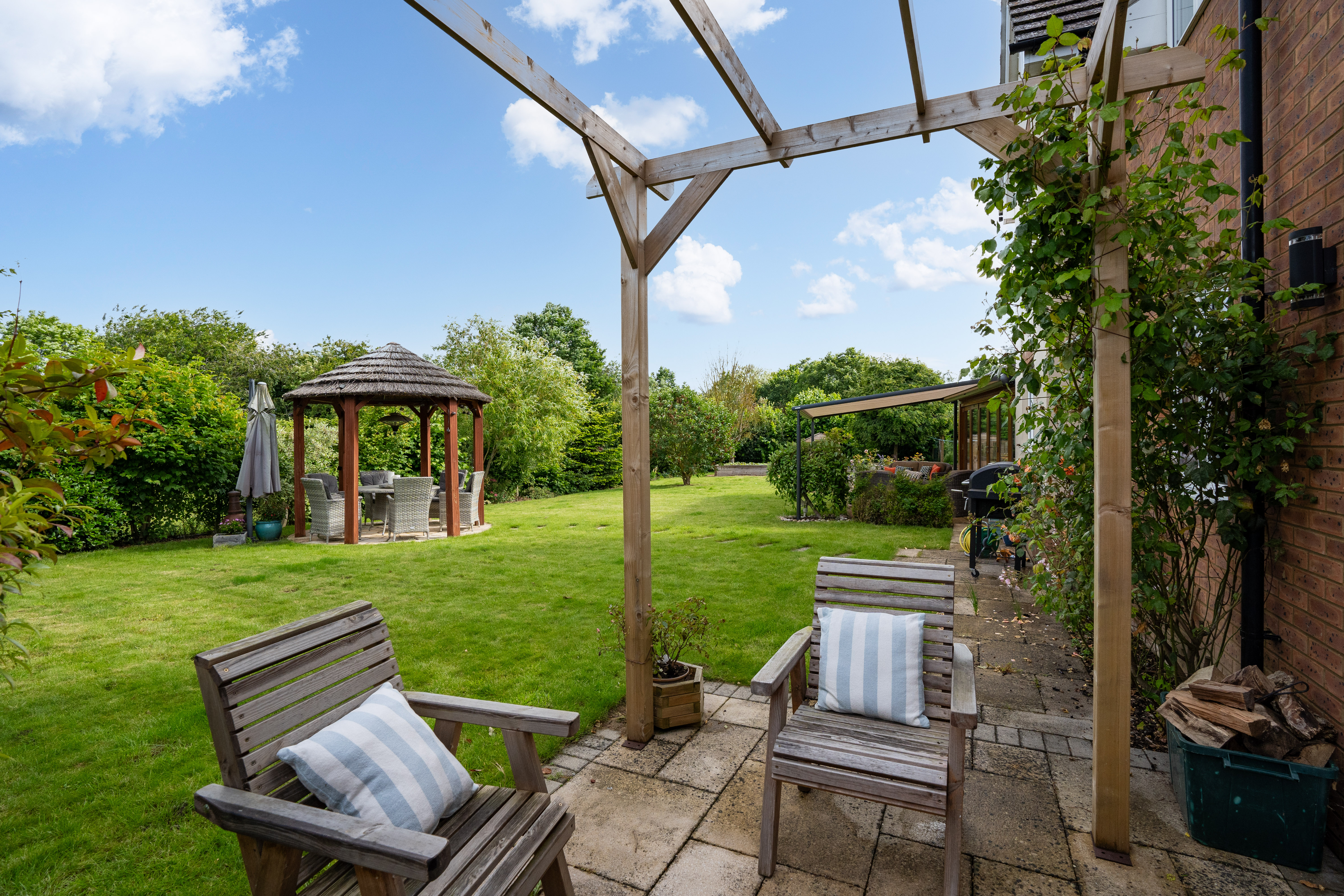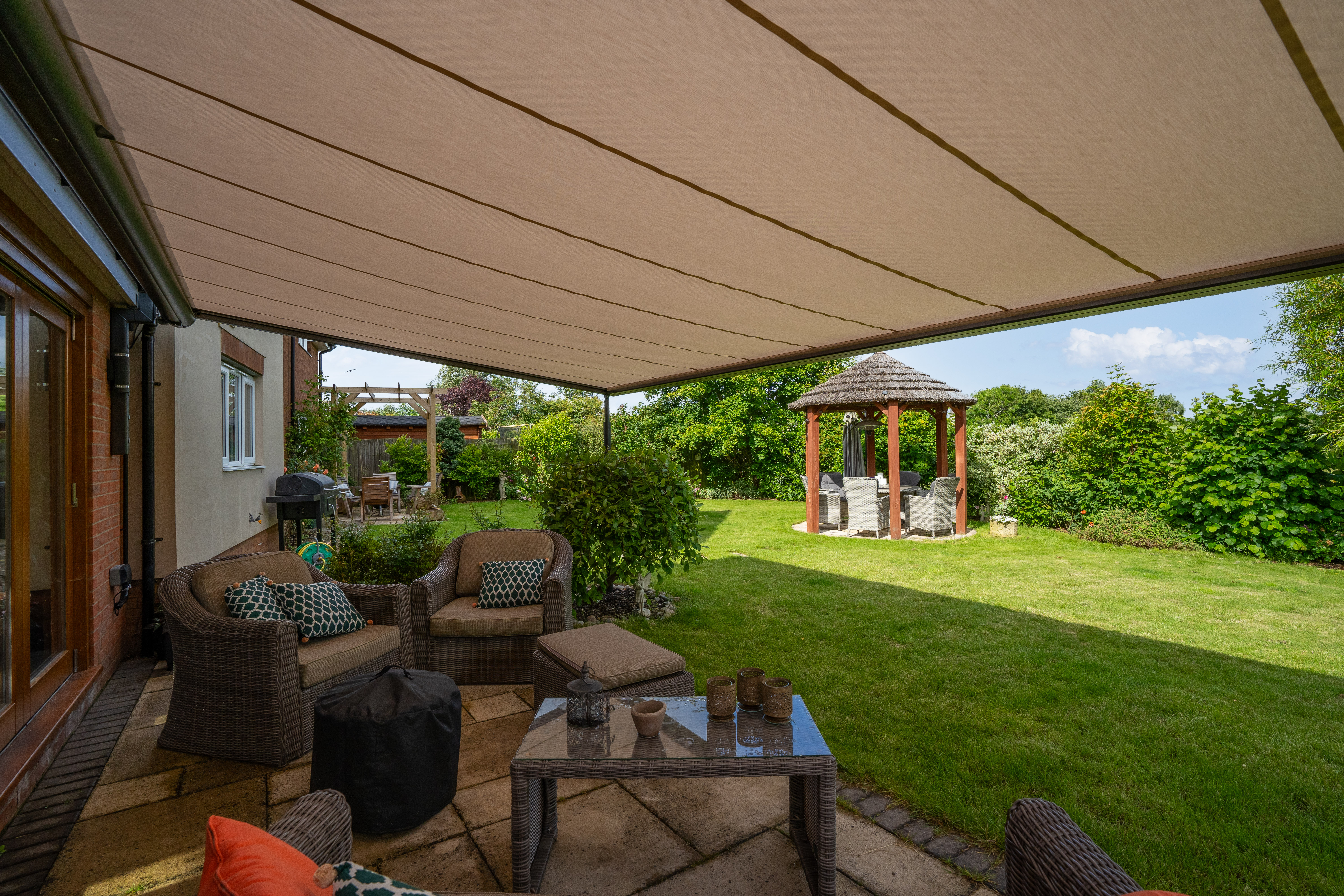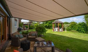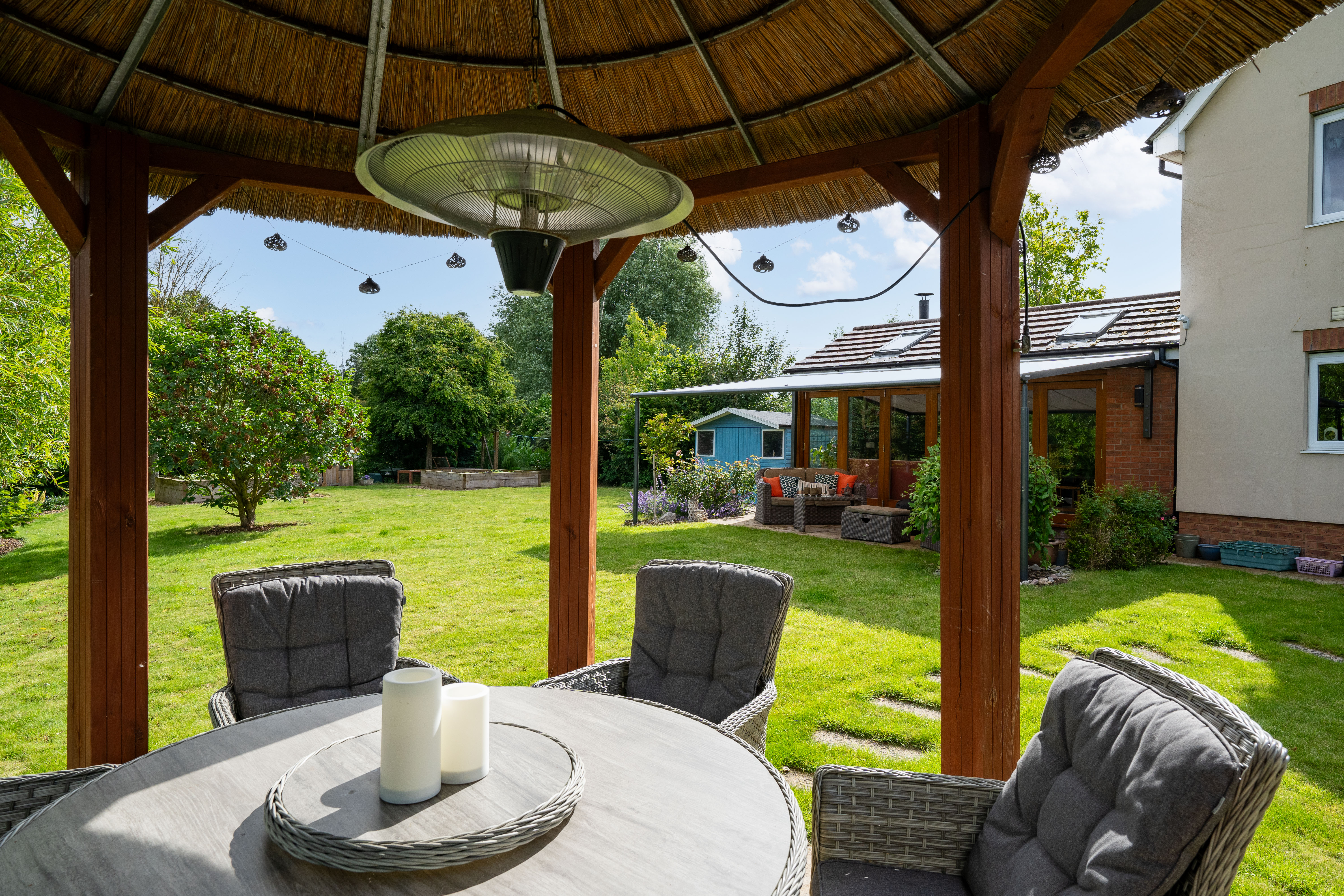To the front of the property is a driveway providing off-road parking for numerous vehicles and leading to a detached double garage with up and over door, power and light connected, overhead storage and personal door to the side. A gated side access leads to the corner plot rear garden which is laid mainly to lawn and enclosed by fencing, including a recently installed retractable awning over the patio offering protection from sun and rain, with various flowers and shrubs set to borders and beds, mature trees, timber shed, gazebo and outside tap, with wonderful views over open fields.