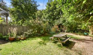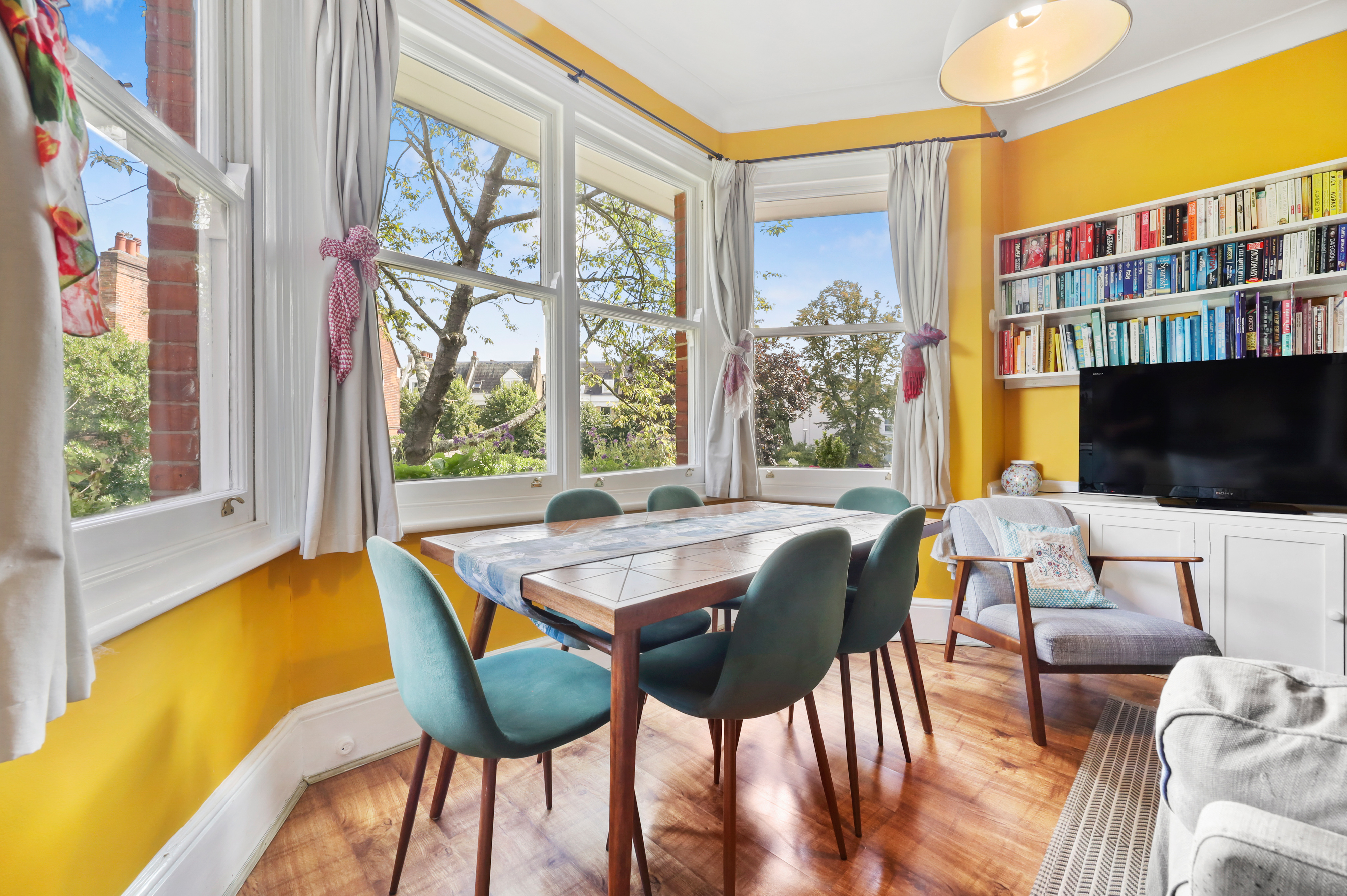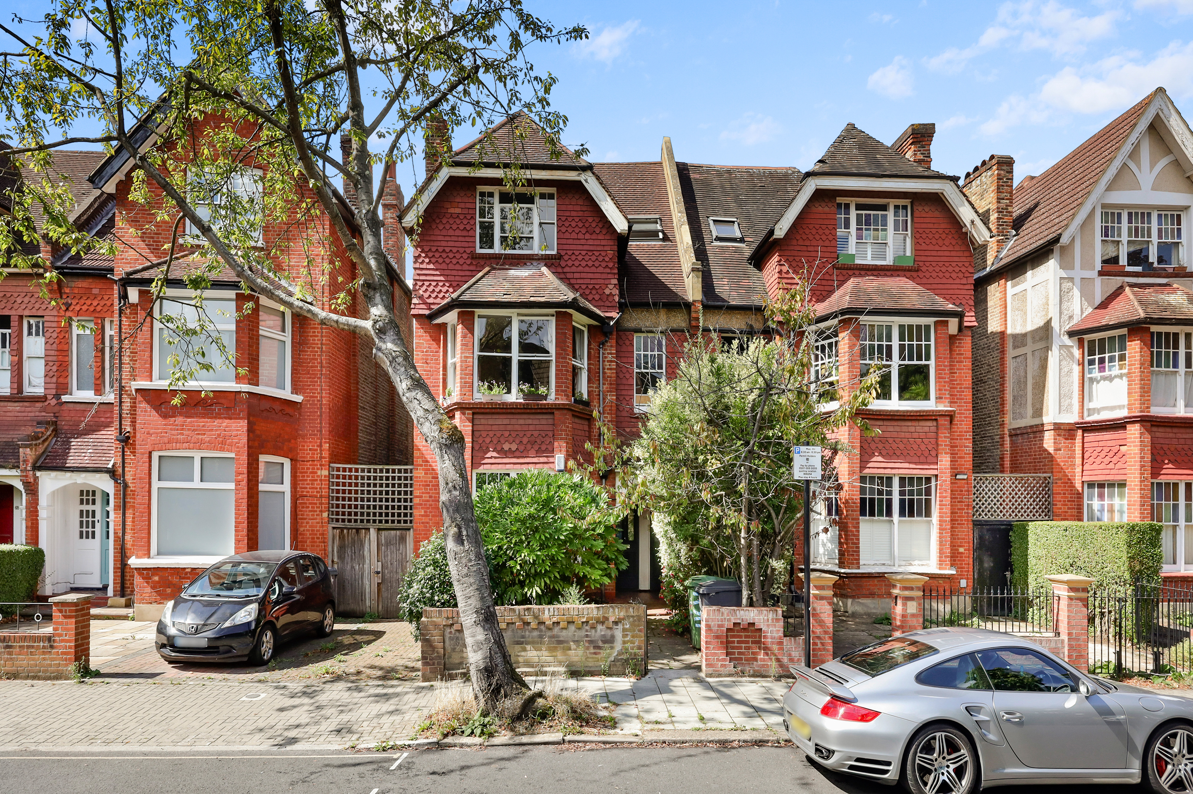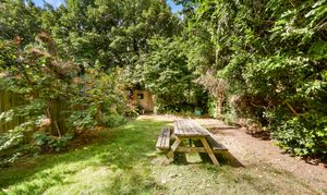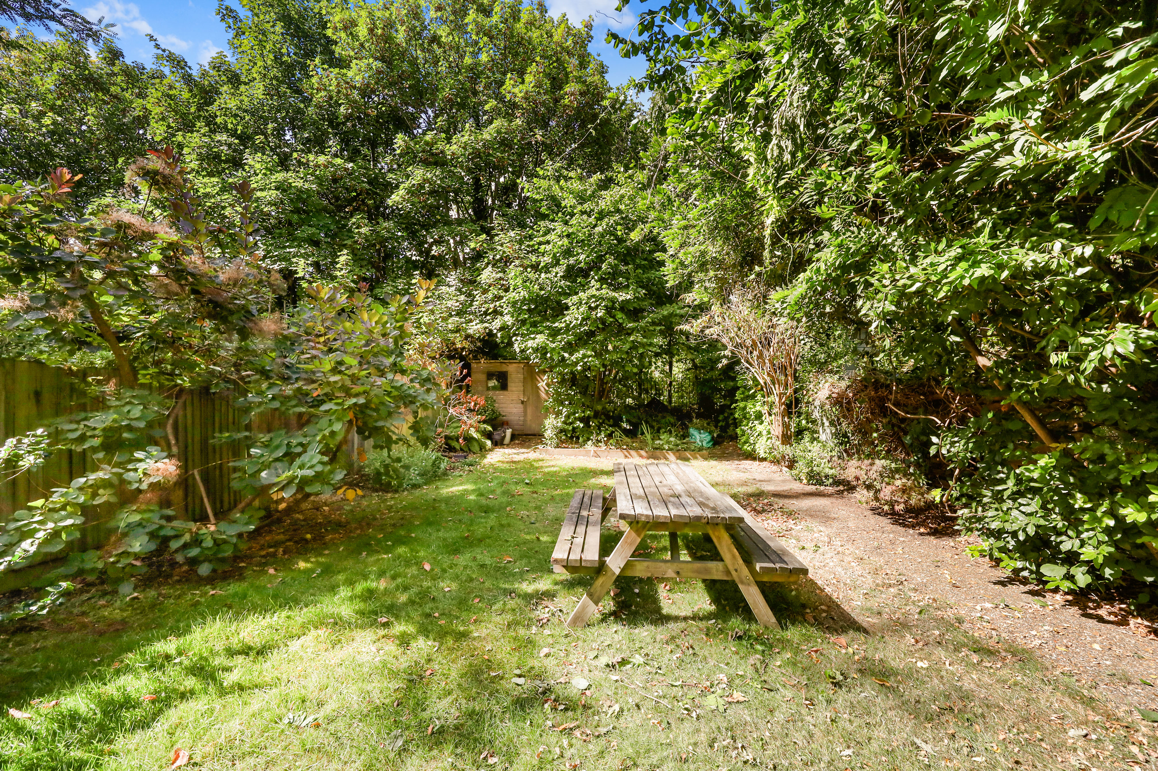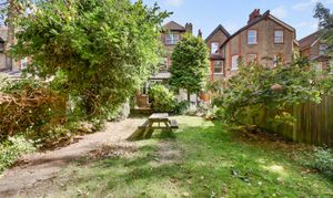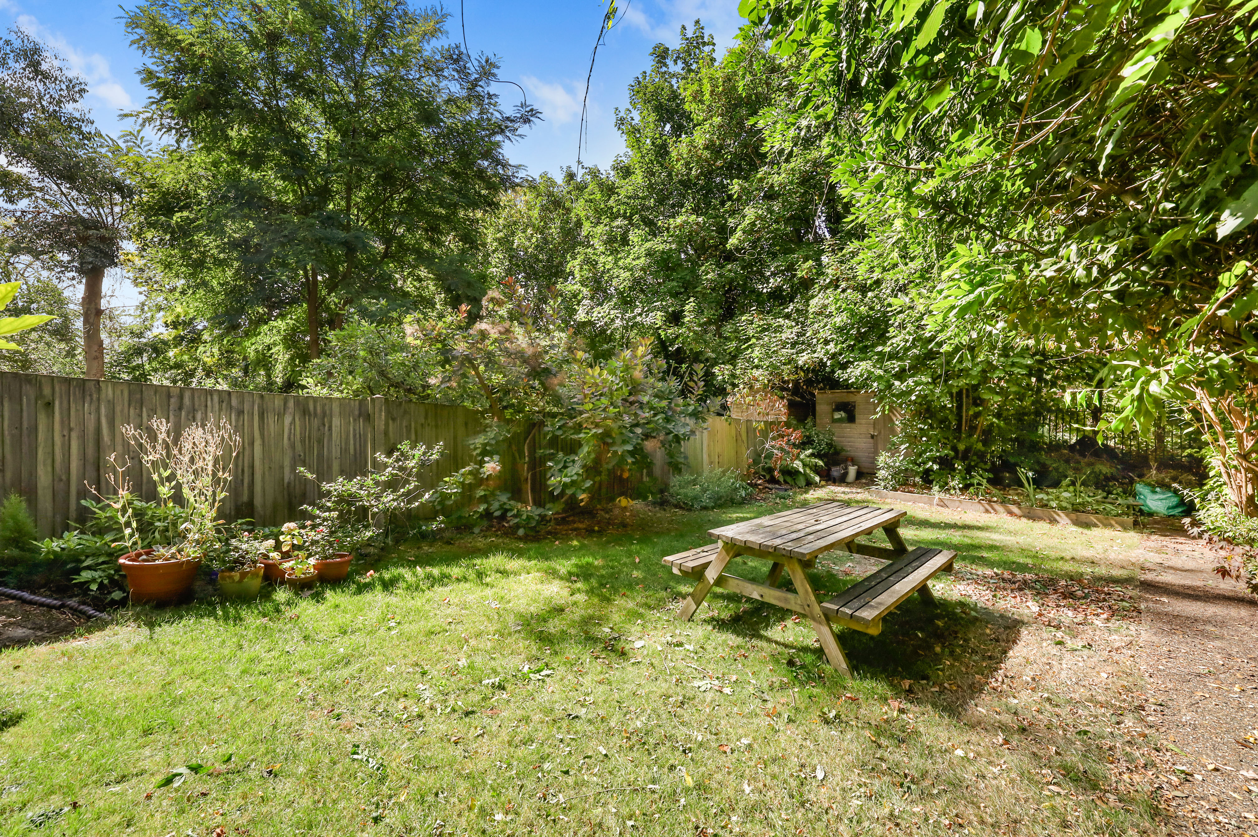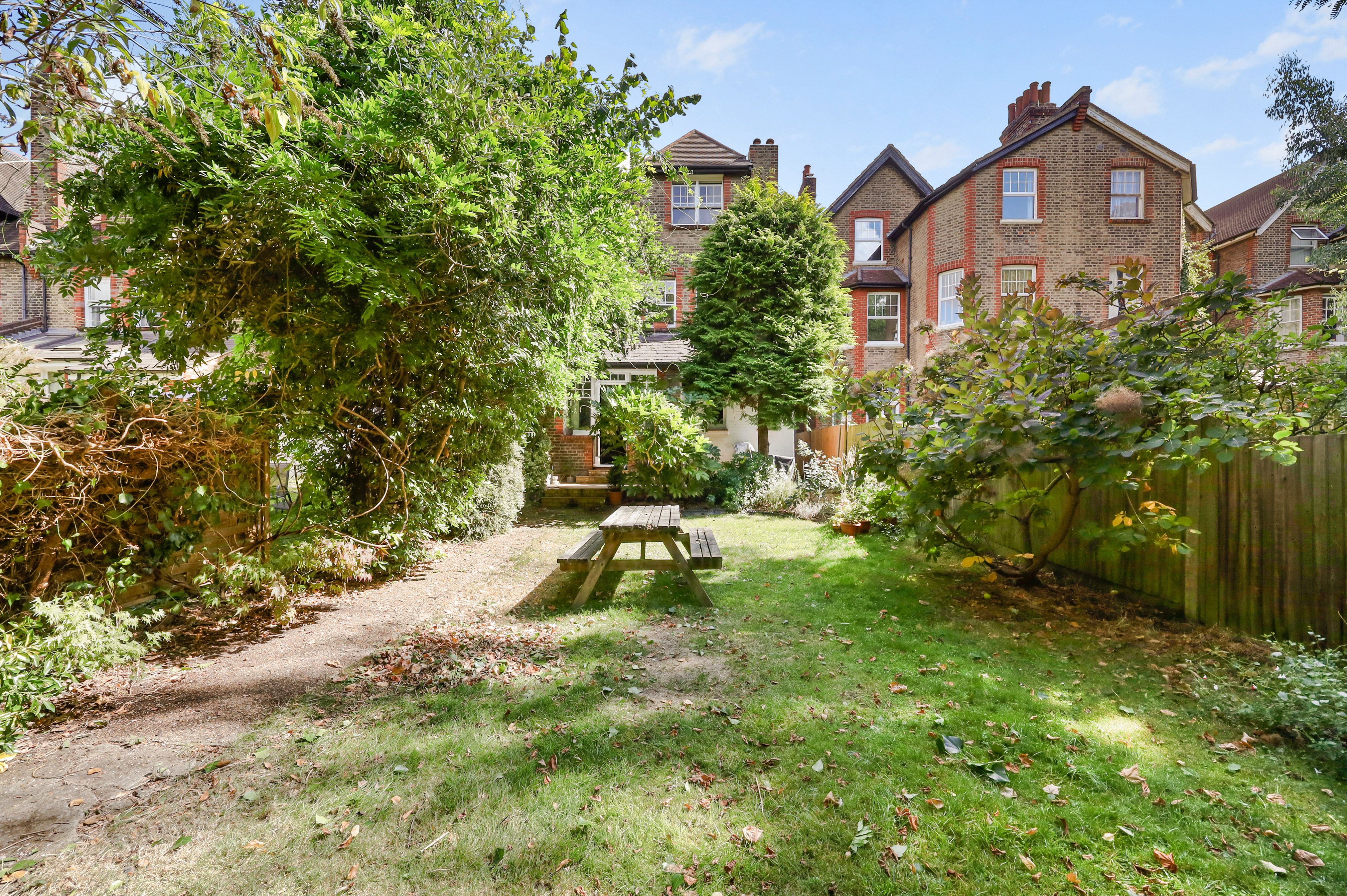 To the rear is a large west-facing garden, shared with just two other flats. Surrounded by trees, it provides a lovely green outlook and includes a generous lawned area, a shed and a vegetable patch.