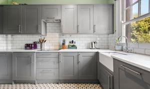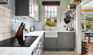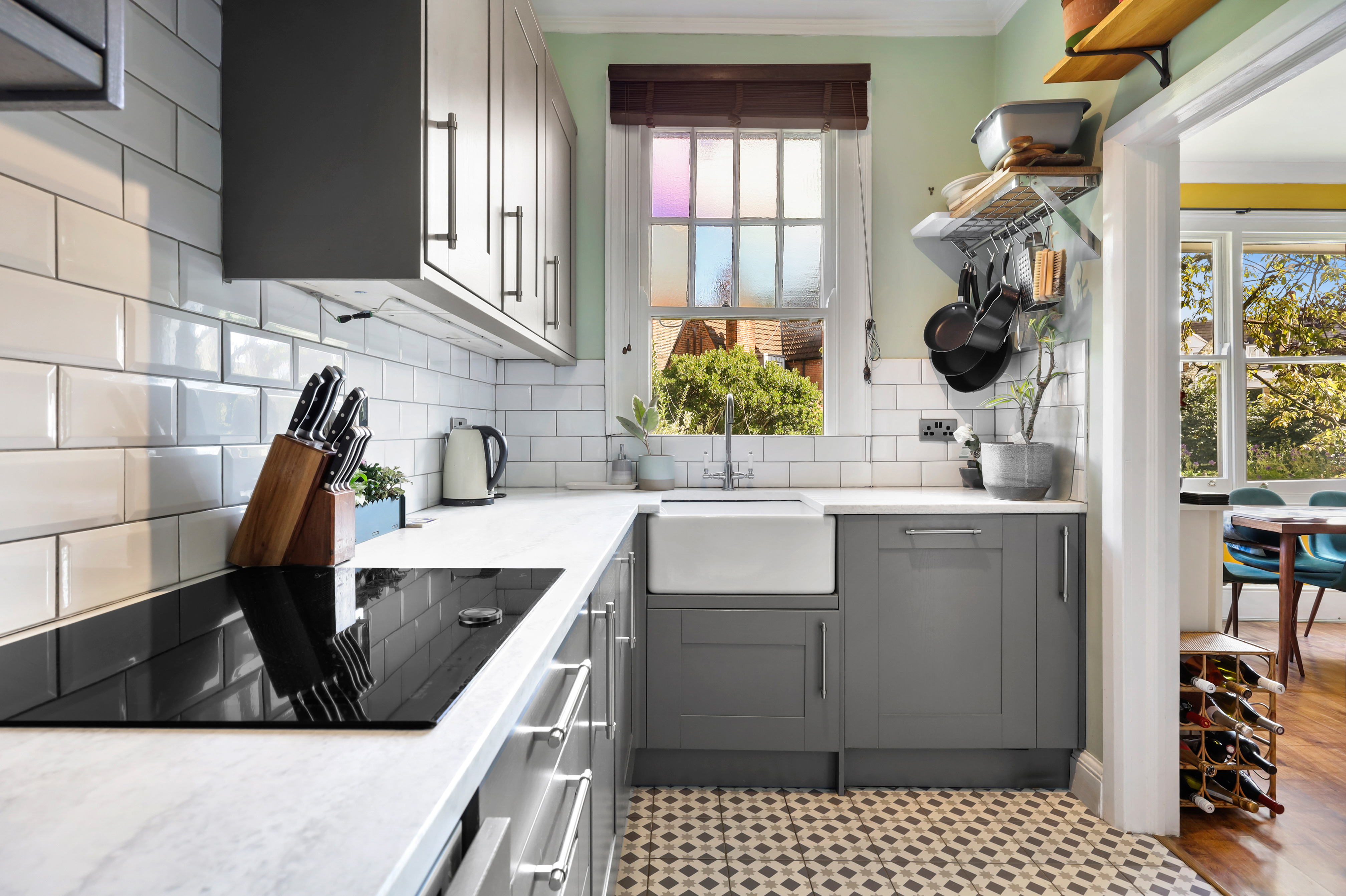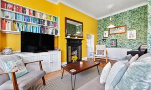 The bright and elegant reception room enjoys a front-aspect bay window, flooding the space with natural light, and features an ornate cast-iron fireplace with tiled insert. An opening leads through to the semi-open-plan kitchen, fitted with a sleek range of matching wall and base units, ample work surfaces and storage, a Belfast sink, and integrated appliances.