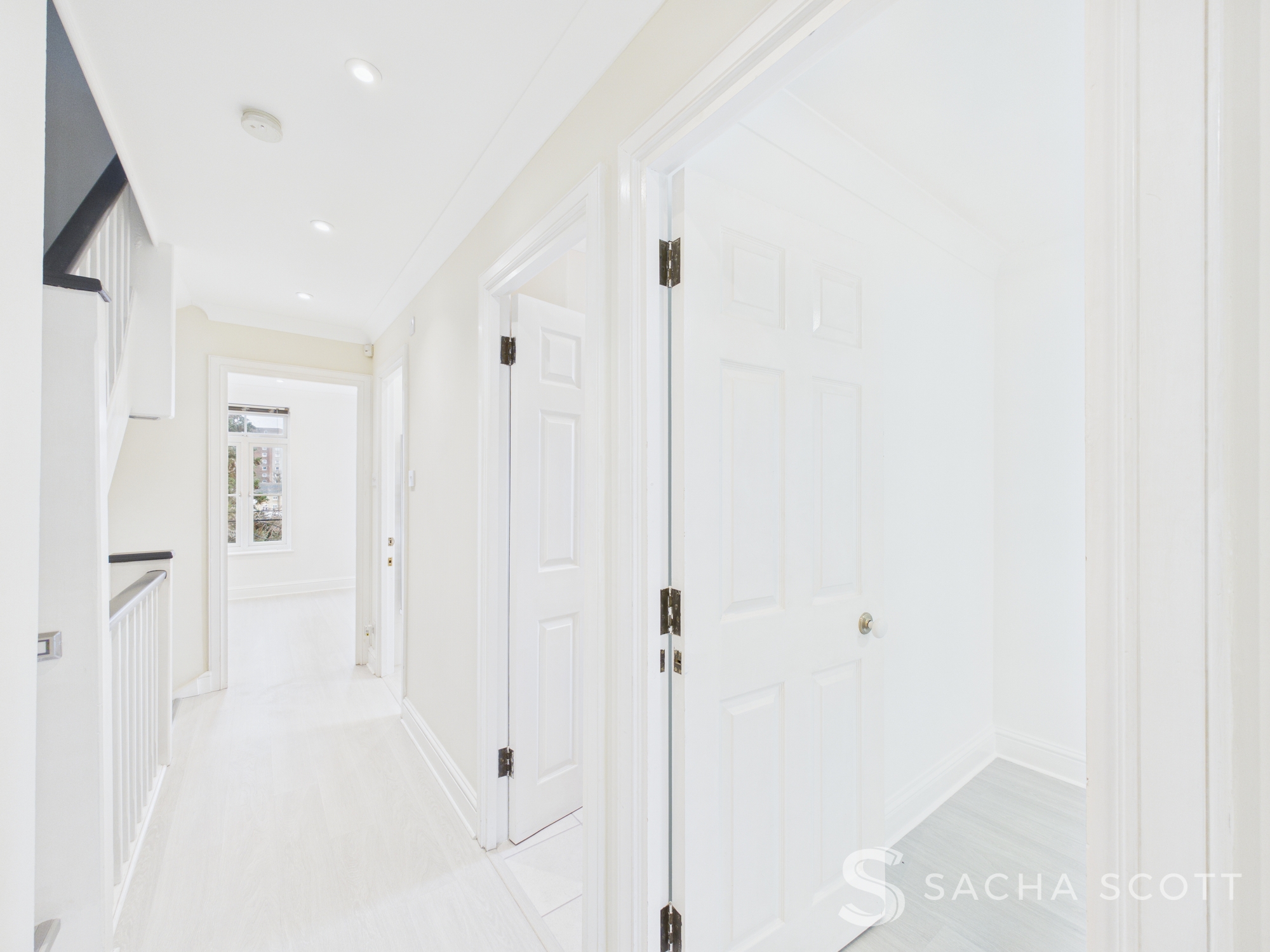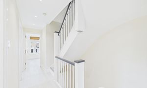 The hall landing offers neutral decor throughout.
