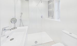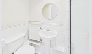 Part tiled, the en-suite to bedroom 2 offers a shower enclosure with pump booster, WC, sink and radiator.