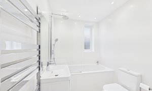Fully tiled, the family bathroom is located on the first floor and offers a shower over the bath with screen, a vanity sink unit, WC and heated towel rail.