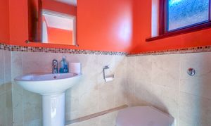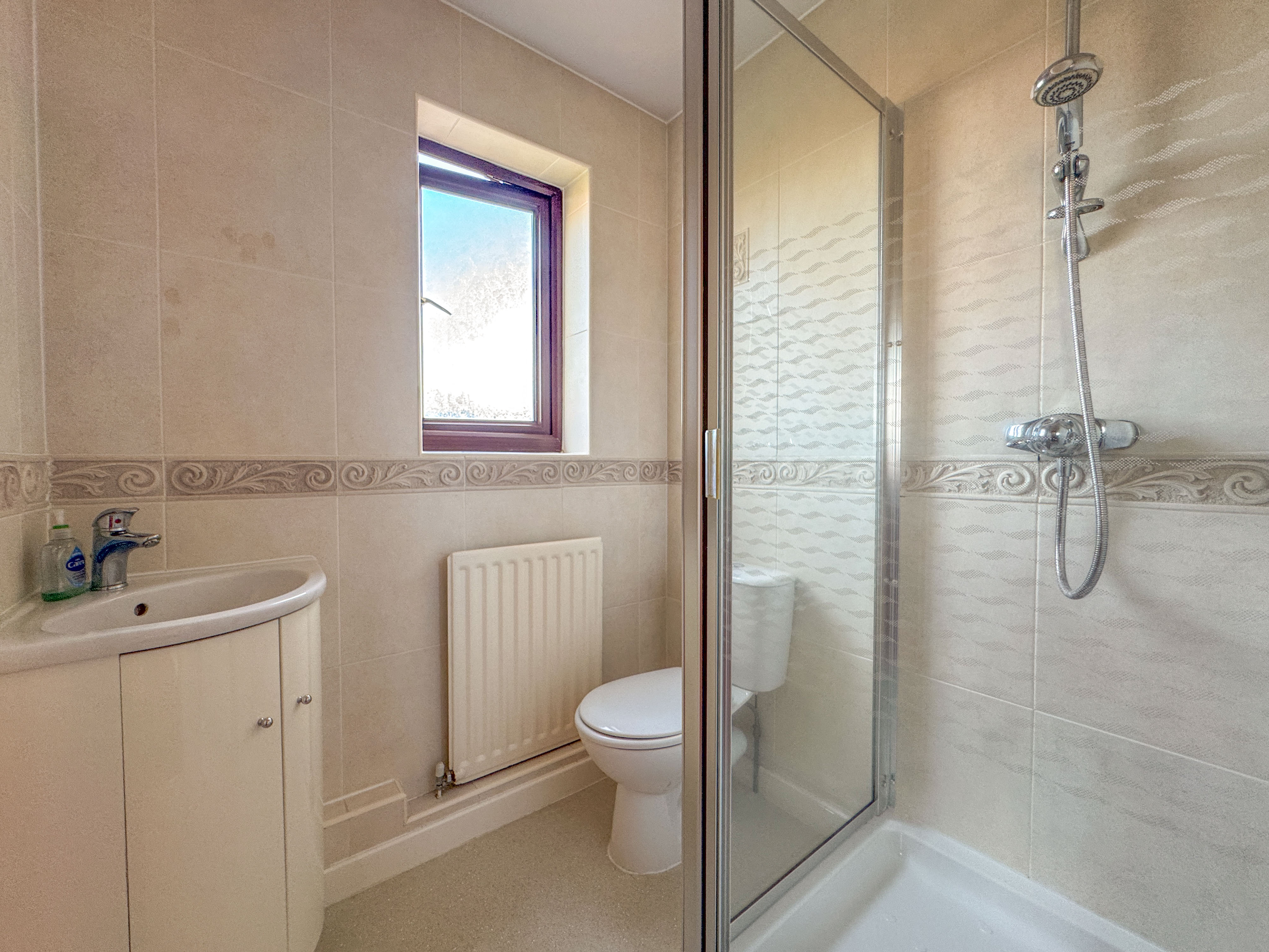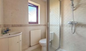 Upstairs, a galleried landing leads to four well-sized bedrooms. The principal bedroom benefits from fitted wardrobes and a private en-suite shower room, comprising a walk-in shower enclosure with mains shower and a white suite. A modern wet room with two-piece suite and walk-in shower serves the remaining bedrooms.
