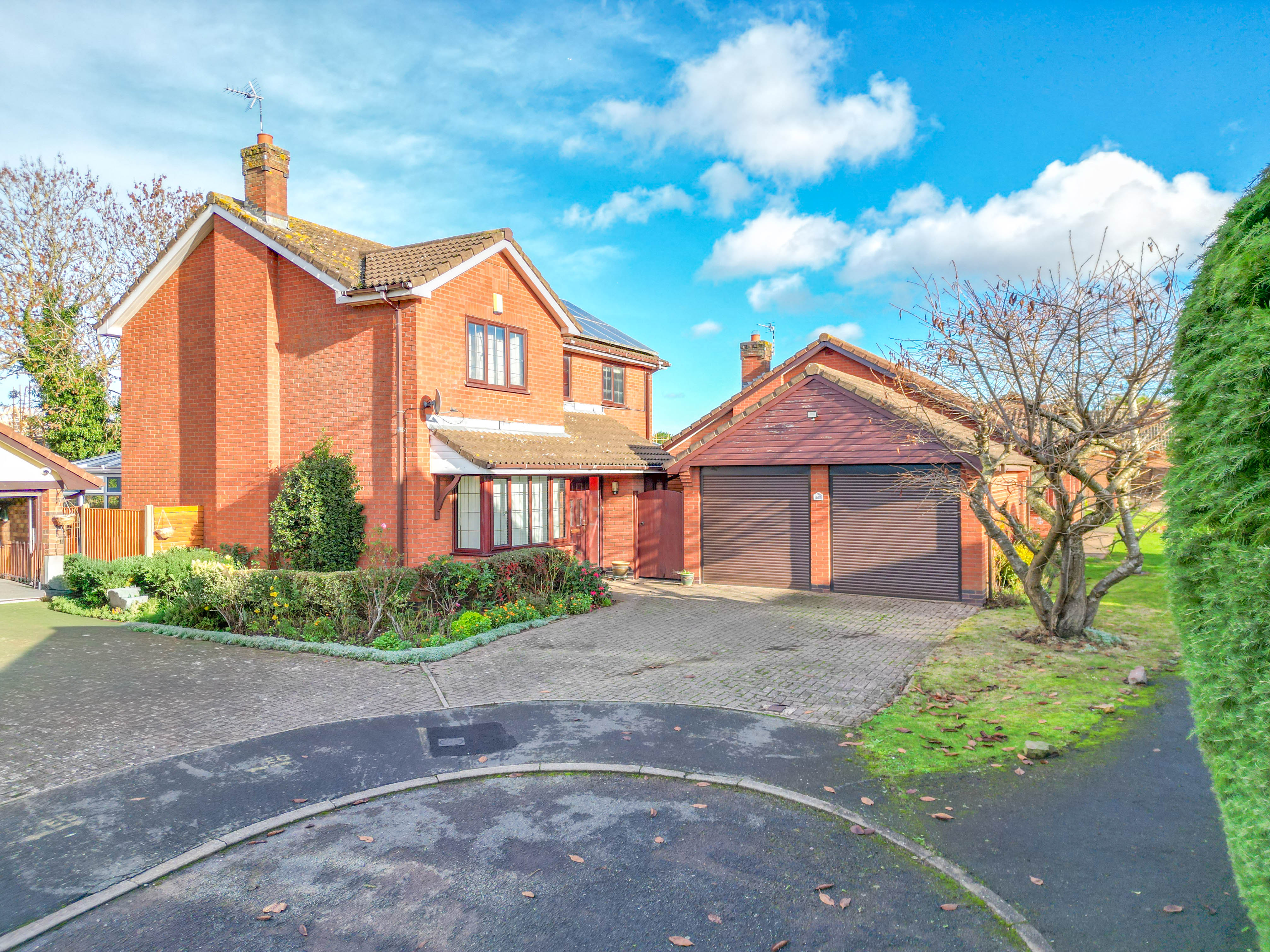 Externally, the property continues to impress. The front is neatly laid out with a double-width driveway providing off-road parking and leading to the detached double garage, which features an EV charging point and a personnel door to the rear garden.