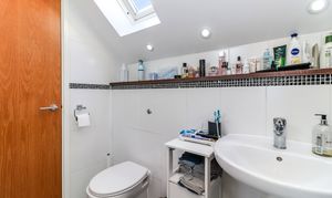 Upon entering, the hallway gives way to a bright and modern kitchen/dining room, fitted with sleek cabinetry, integrated appliances and ample space for cooking, dining and everyday gatherings. To the rear, the living room enjoys an attractive outlook over the garden and features French doors paired with overhead skylights, creating a superb sense of light and connection to the outdoors. A guest cloakroom completes the ground floor.
