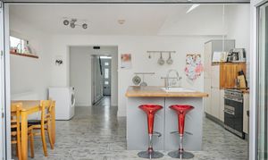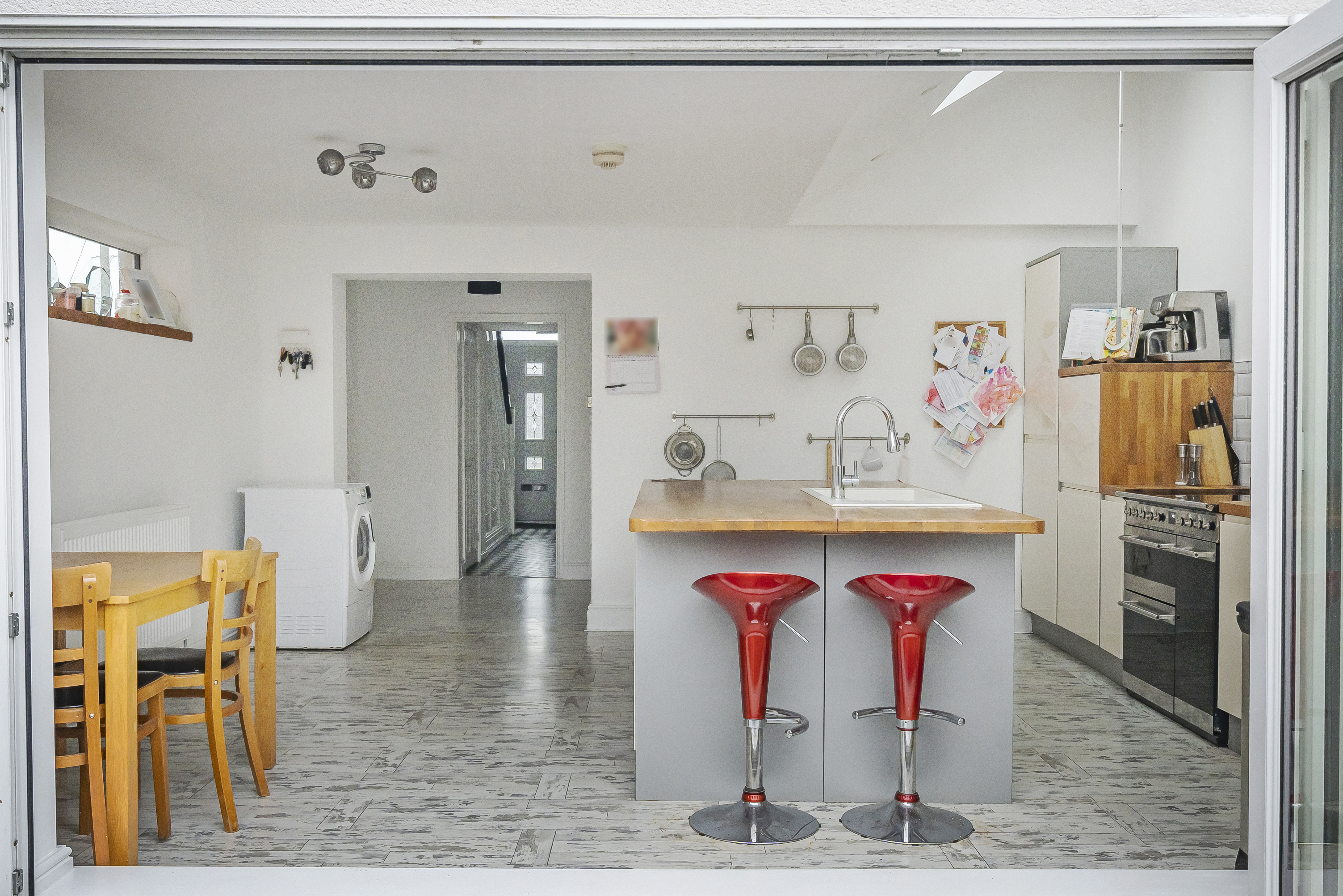 The kitchen/breakfast room is a standout feature, boasting vaulted ceilings, skylights, an island with a sink, and a built-in washing machine. There is also a built-in fridge freezer and bifolding doors that open onto a low-maintenance enclosed GARDEN—perfect for entertaining.