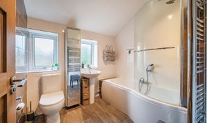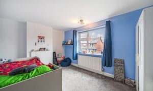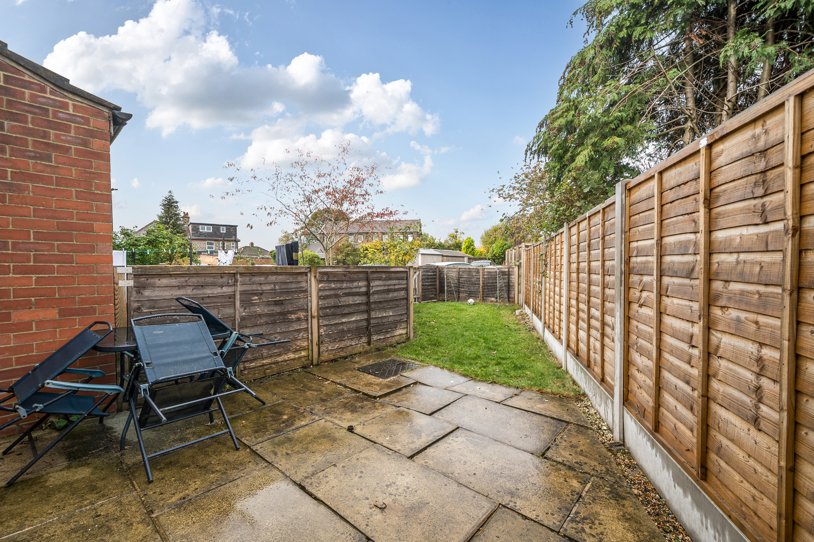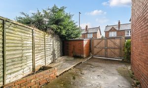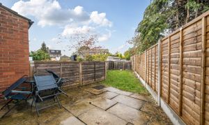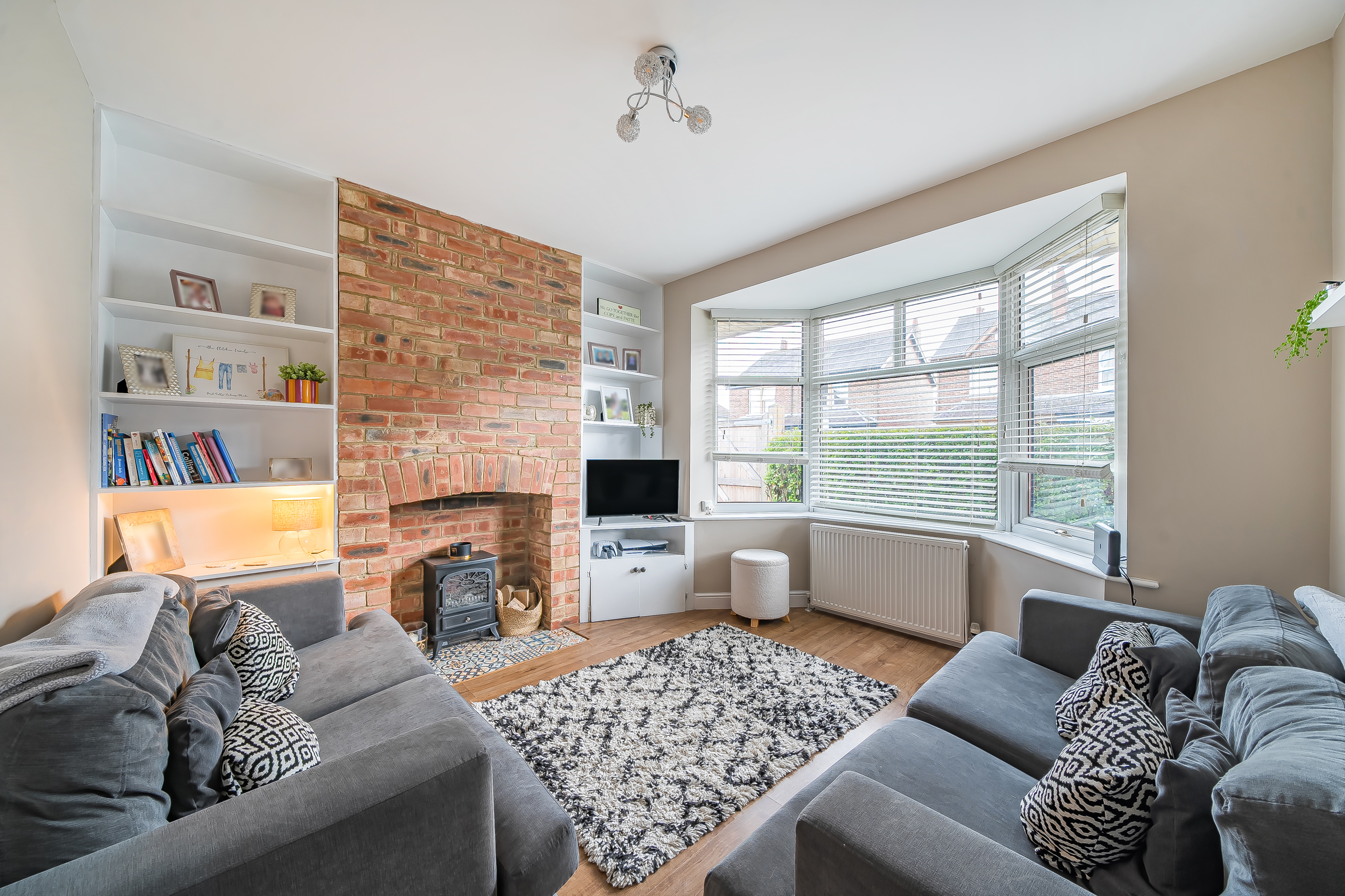 Offering just under 1,000 square feet of accommodation, the house sits behind a mature hedge and fence for added privacy and opens into a central hall. To the front, the bay-fronted sitting room features an exposed brick fireplace with recessed shelving, creating a lovely focal point. To the rear, a dining/family room provides ample space for a family-sized table and leads through to a modern fitted kitchen. A door opens out to the enclosed rear garden with a flagged patio entertaining area and lawn beyond. Upstairs, the first floor offers two well-proportioned double bedrooms and a stylish tiled house bathroom with an over-bath shower, while the second floor provides a further generous double bedroom with excellent eaves storage. Timber gates at the front open to the private parking space, and additional on-street permit parking is also available.