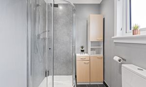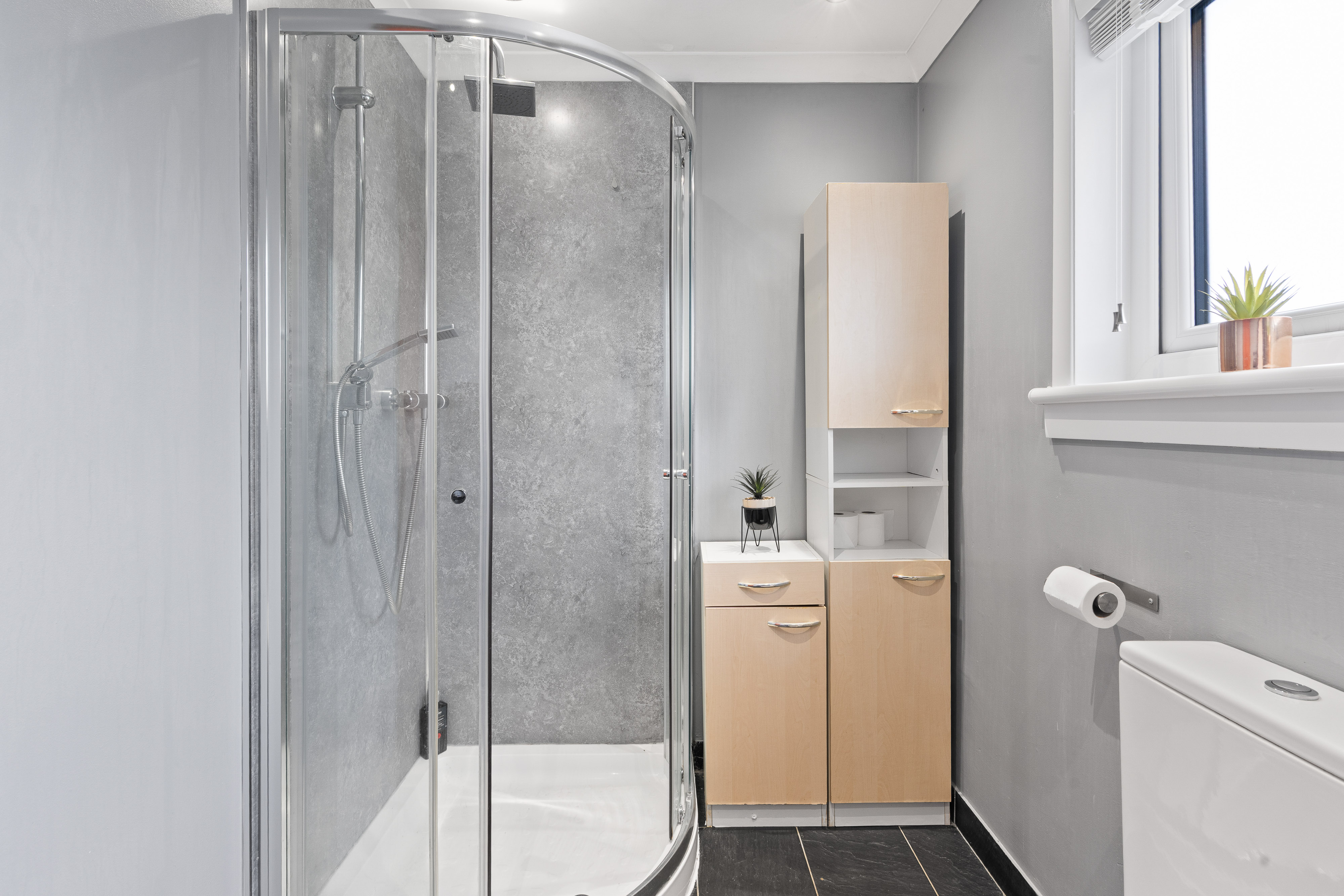 The bathroom has been renovated and is finished with wet wall panelling within the shower enclosure, chrome accents and splashback tiling around the sink. It comprises a modern three piece suite with a standing shower, offering a clean and practical layout.