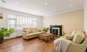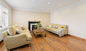 Upon entering, you are welcomed into a bright and inviting hallway that leads through the heart of the home. Positioned to the front of the property is the spacious lounge, a comfortable and well proportioned room that easily accommodates two large sofas and a media wall. A feature fireplace provides a focal point, while large windows allow natural light to flood the space, creating a warm and relaxing environment.