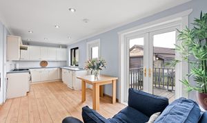 Further along the hallway towards the rear sits the impressive open plan kitchen and dining area. Designed with both practicality and entertaining in mind, the kitchen features white cabinetry, generous worktop space, and an eight burner gas cooker as a standout centrepiece. There is ample space for a dishwasher, washing machine, and even an American style fridge freezer if desired. Spotlights enhance the modern feel, and the dining area comfortably seats around five people. Patio doors open directly onto the rear decking, creating a seamless indoor outdoor flow ideal for entertaining.