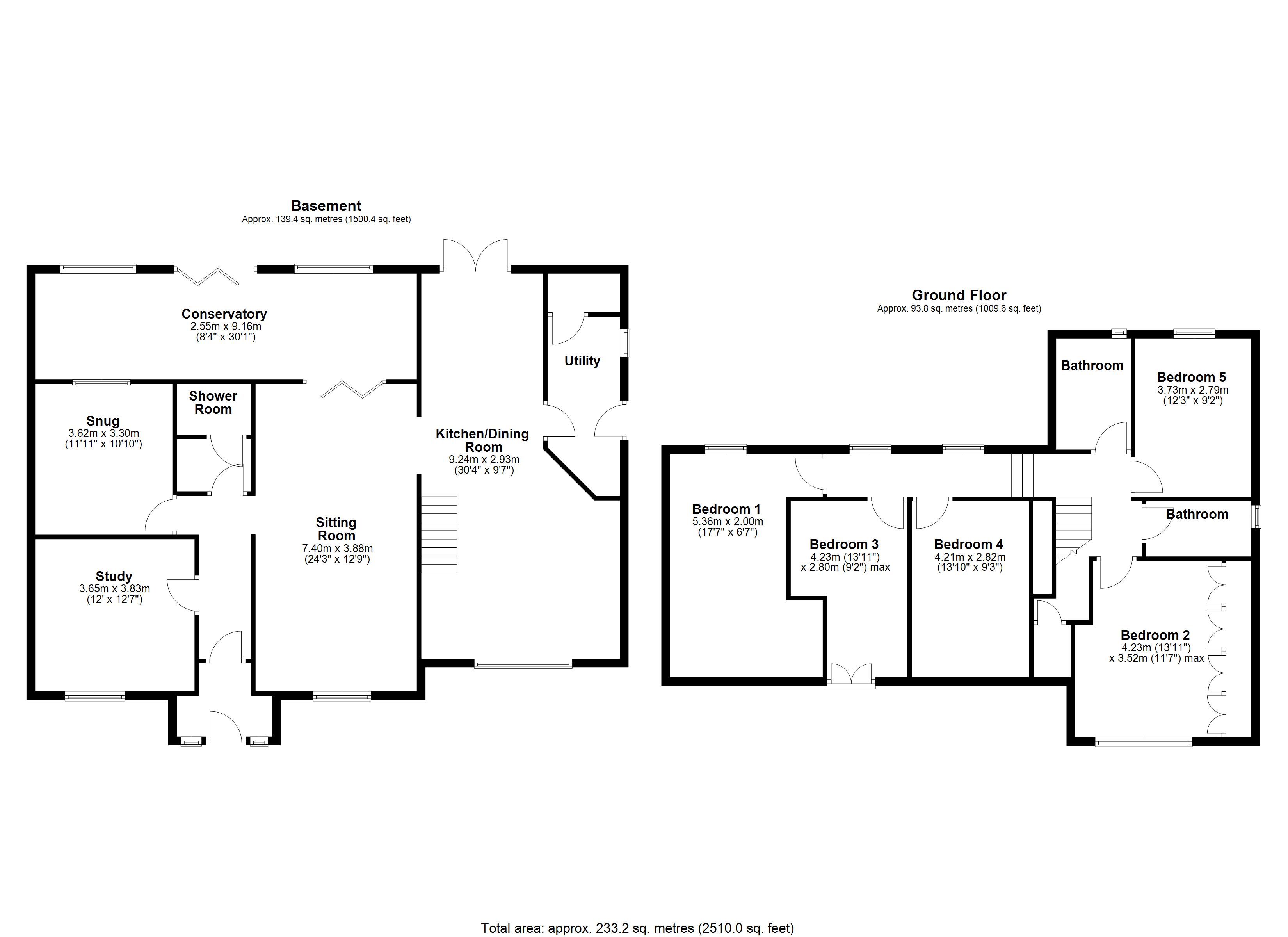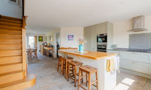 The layout offers three reception rooms on the ground floor which include a large study, a snug and a sitting room, again these offer a variety of layout choices. From the sitting room there are bifold doors to the conservatory which overlooks the rear garden. The heart of many homes is the kitchen and this one doesn’t disappoint. With an island breakfast bar and room for a large table, it’s ideal for those with families and who like entertaining, being able to cook and chat at the same time! As one would expect, there’s also a ground floor WC/shower room and a separate utility room too. On the first floor are five bedrooms with views in both directions, and two bathrooms.