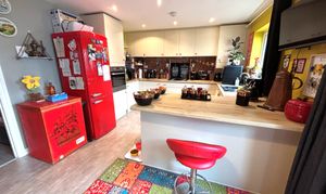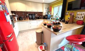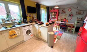 The kitchen has a dividing breakfast bar as well as a dining area with room for a table and chairs. The kitchen comprises base and wall units with the boiler concealed in a wall cupboard, work top, stainless steel sink unit, gas hob, electric oven, plumbing and space for a washing machine and plumbing provision for a dishwasher. At the dining end there is an understairs recess where there is space for a tumble dryer.