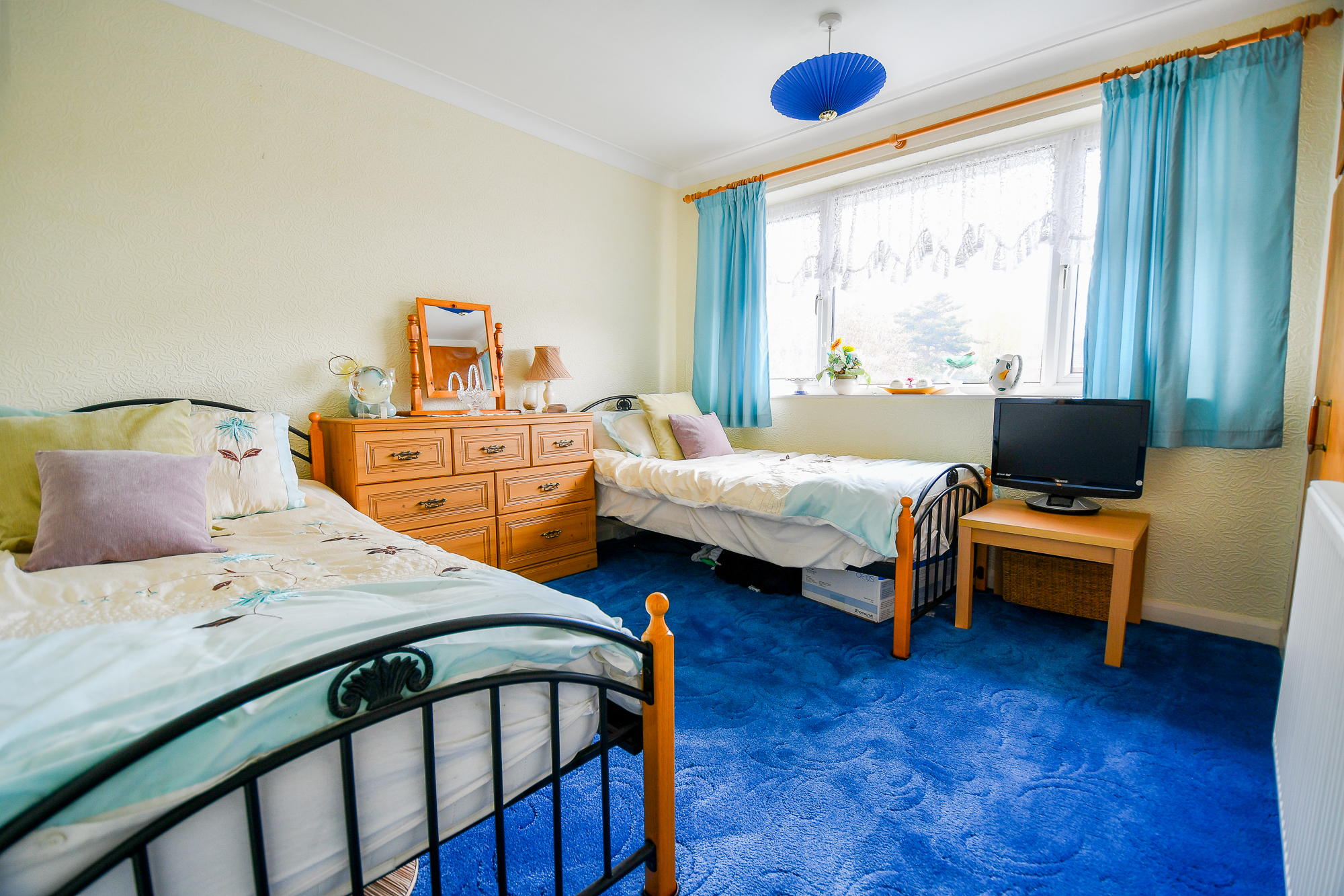 A well-proportioned double room with carpet underfoot, a large window allowing in natural daylight, fitted wardrobe, radiator, and central light fitting.