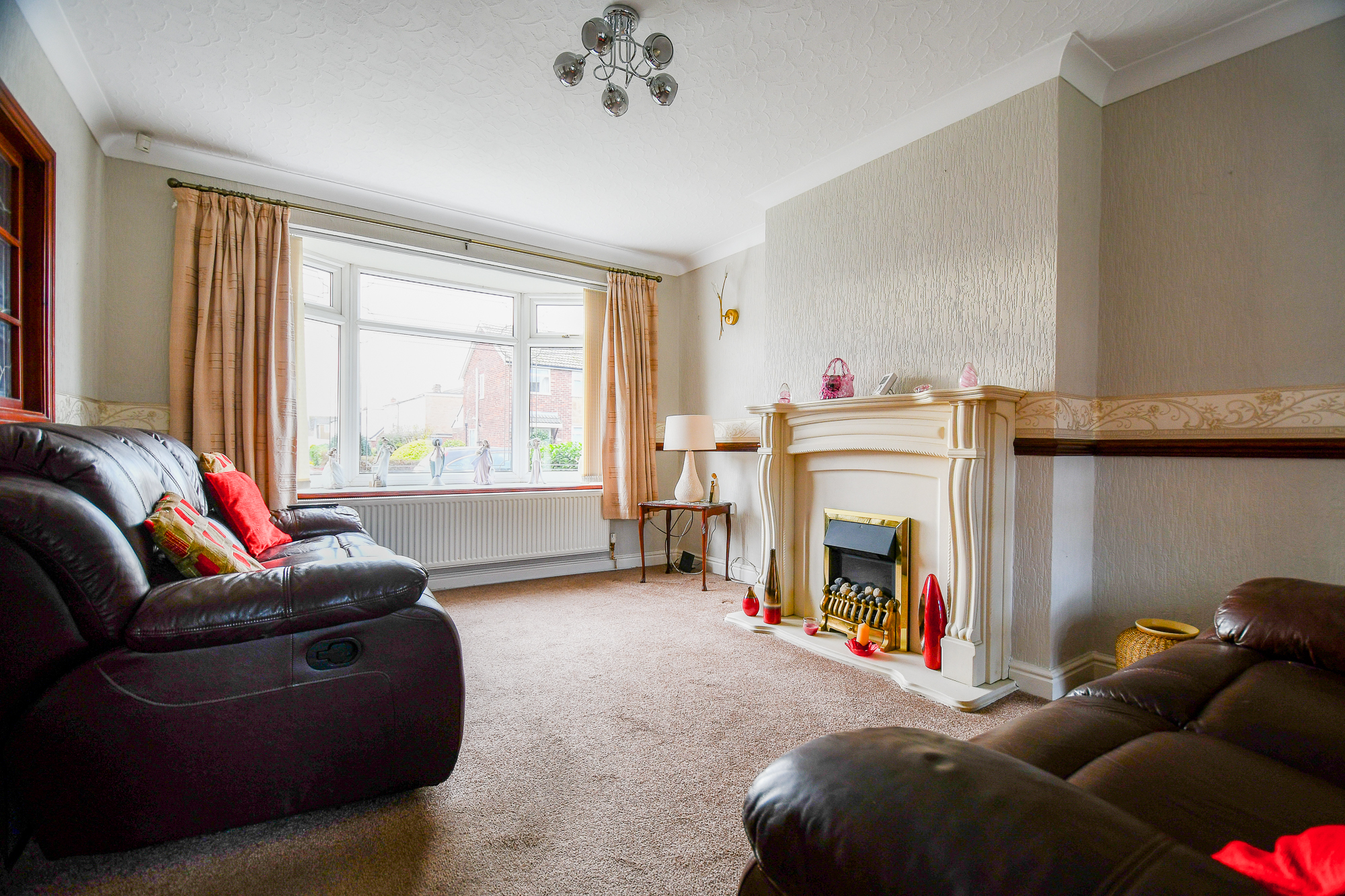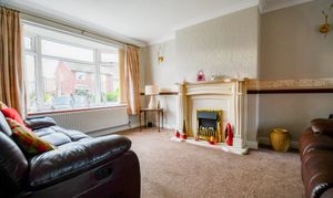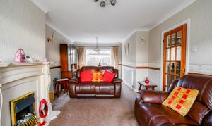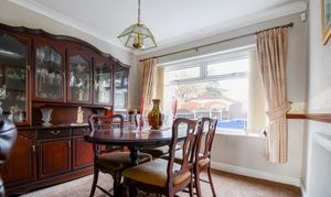 This spacious dual-purpose room benefits from a carpeted floor and wallpapered walls, creating a comfortable living and dining environment. A gas fireplace forms a focal point, while two radiators and ceiling lights add both practicality and comfort. The room enjoys excellent natural light through double-glazed windows, including a charming bay window overlooking the front aspect.
