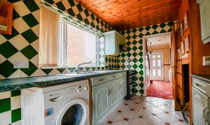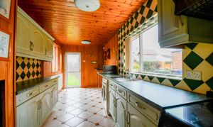 Inside, the spacious lounge/diner enjoys excellent natural light through a bay window, complemented by a traditional gas fireplace and two radiators for year-round comfort. The kitchen is bright and practical, with tiled flooring, wood-clad walls and ceiling, and ample fitted units, ideal for those with an eye for design who want to create their dream cooking space.