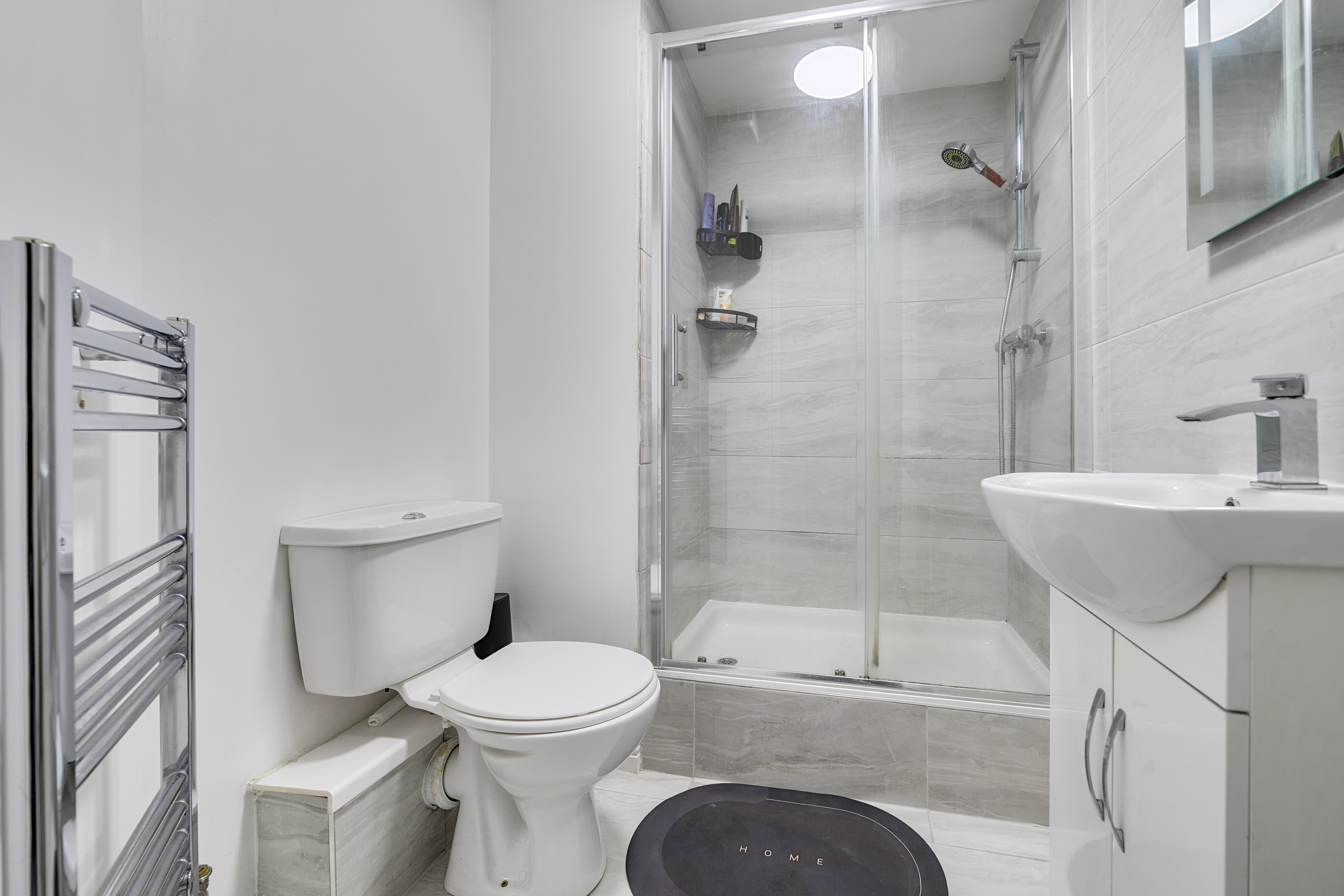 Both bedrooms are doubles and overlook the rear of the building. The main bedroom includes fitted wardrobes and a dressing table, along with a modern en suite shower room. The en suite features a double shower, vanity wash hand basin, WC, heated towel rail and contemporary tiling to key areas. The second bedroom is also a good size and benefits from built in wardrobes and a dressing table, making it ideal as a guest room, home office or additional sleeping space. The family bathroom is finished in a similar modern style, with a bath and shower over, pedestal wash hand basin, WC and heated towel rail. The property also benefits from double glazing, gas central heating and an allocated parking space.