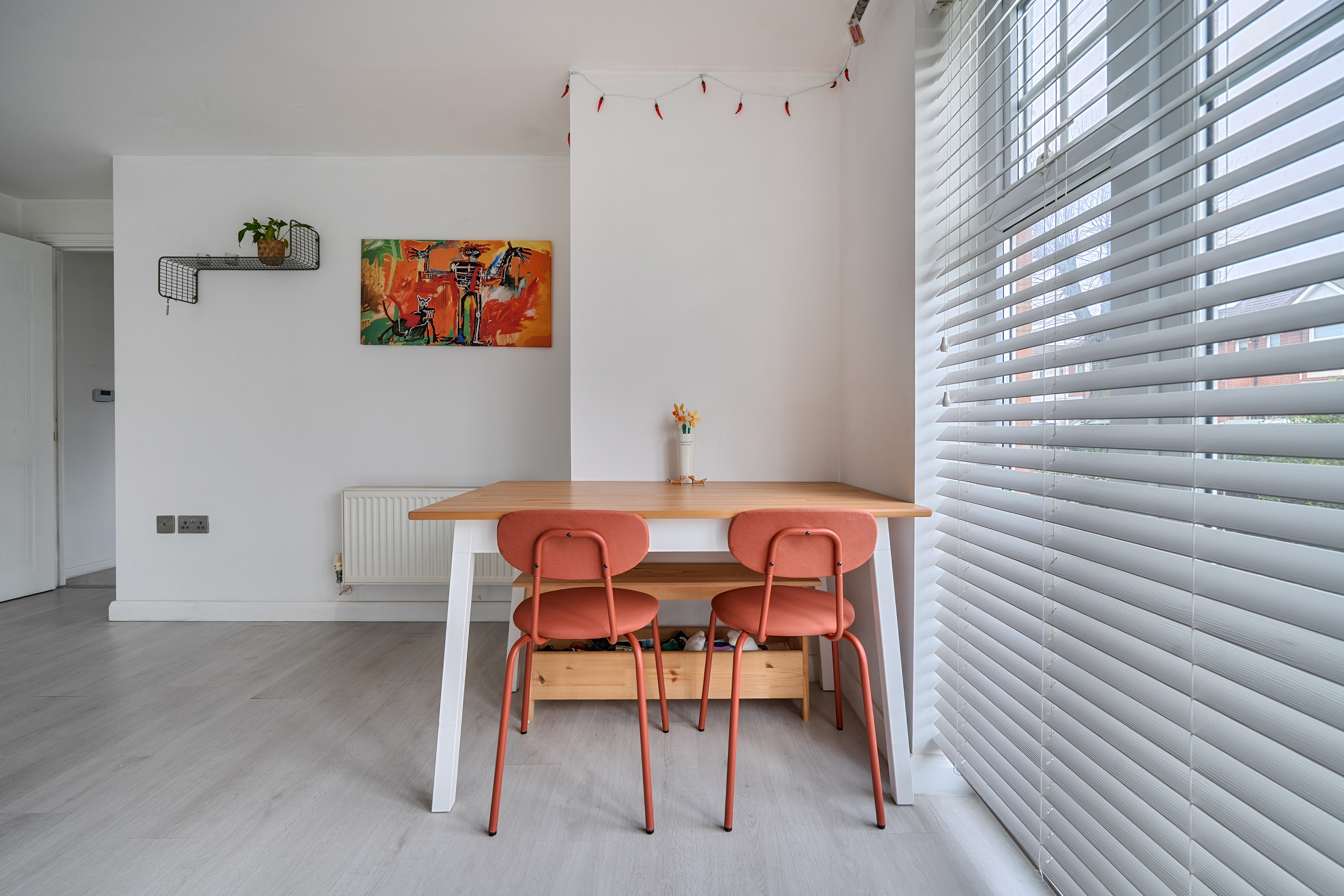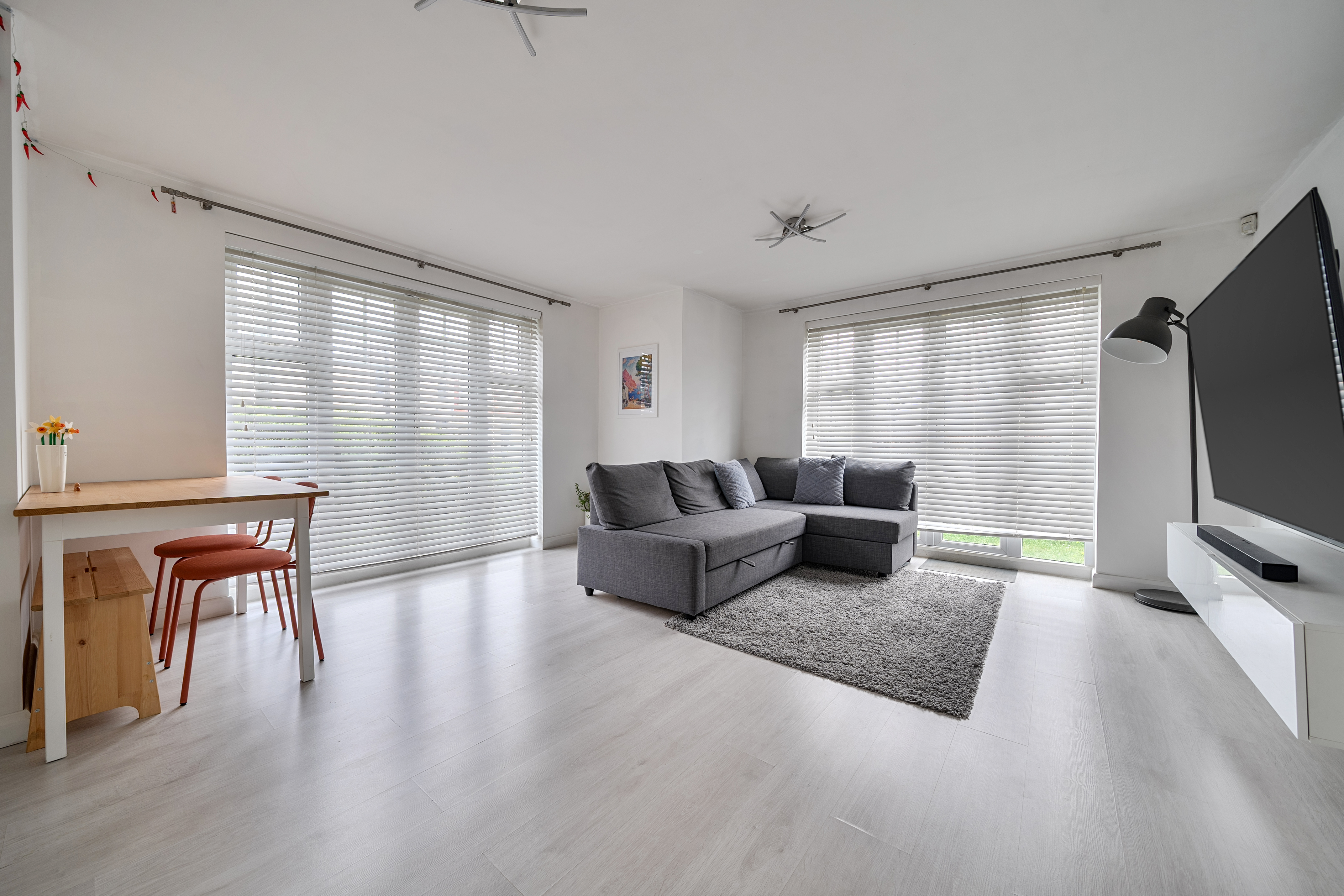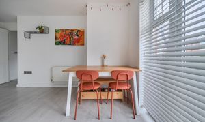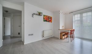 The living dining room is a generous and flexible space, with windows to the rear and side elevations as well as French doors opening onto the communal garden. This layout allows plenty of light to fill the room and gives direct access outside, perfect for enjoying a morning coffee or some fresh air after work. There is ample space for both a comfortable seating area and a dining table, making it easy to relax or entertain.