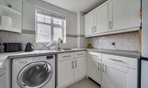 The kitchen is fitted in a contemporary style with a range of wall and base units providing good storage and worktop space. There is a built in oven with gas hob and extractor hood above, along with a stainless steel sink and drainer with mixer tap. Tiling has been added to the main splashback areas for easy cleaning, and there is space for a washer dryer and fridge freezer. A rear aspect window brings in natural light, making it a pleasant place to cook. Laminate flooring runs through the kitchen and continues into the main living areas, creating a smooth and practical finish.