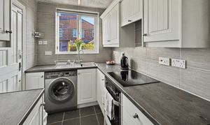 Upstairs, the property boast three bedrooms, comprising two spacious doubles, both with floor to ceiling fitted wardrobes and a well-sized single room, perfect for a child’s bedroom, nursery or home office. A modern tiled bathroom with white two piece suite including bath with overhead shower and floating vanity sink, there is a separate WC for added convenience.