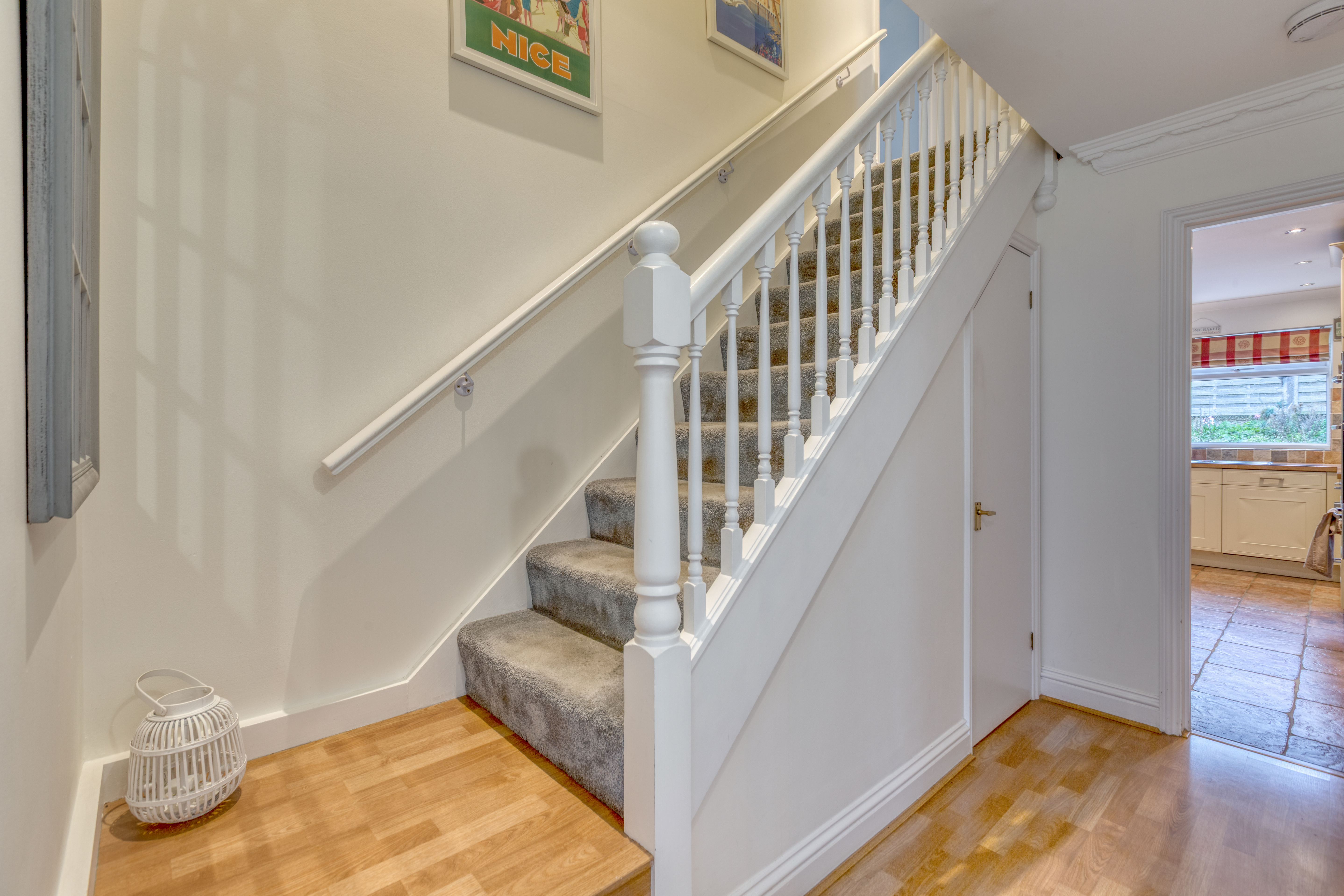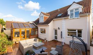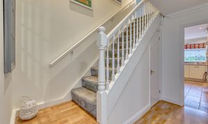 The rear garden is very private and not overlooked and is laid to patio and designed to be easy to maintain, while the front enjoys a south-facing lawned area. Parking is a real advantage, with a garage, driveway parking for several cars, and an additional gravel area suitable for a campervan or boat.