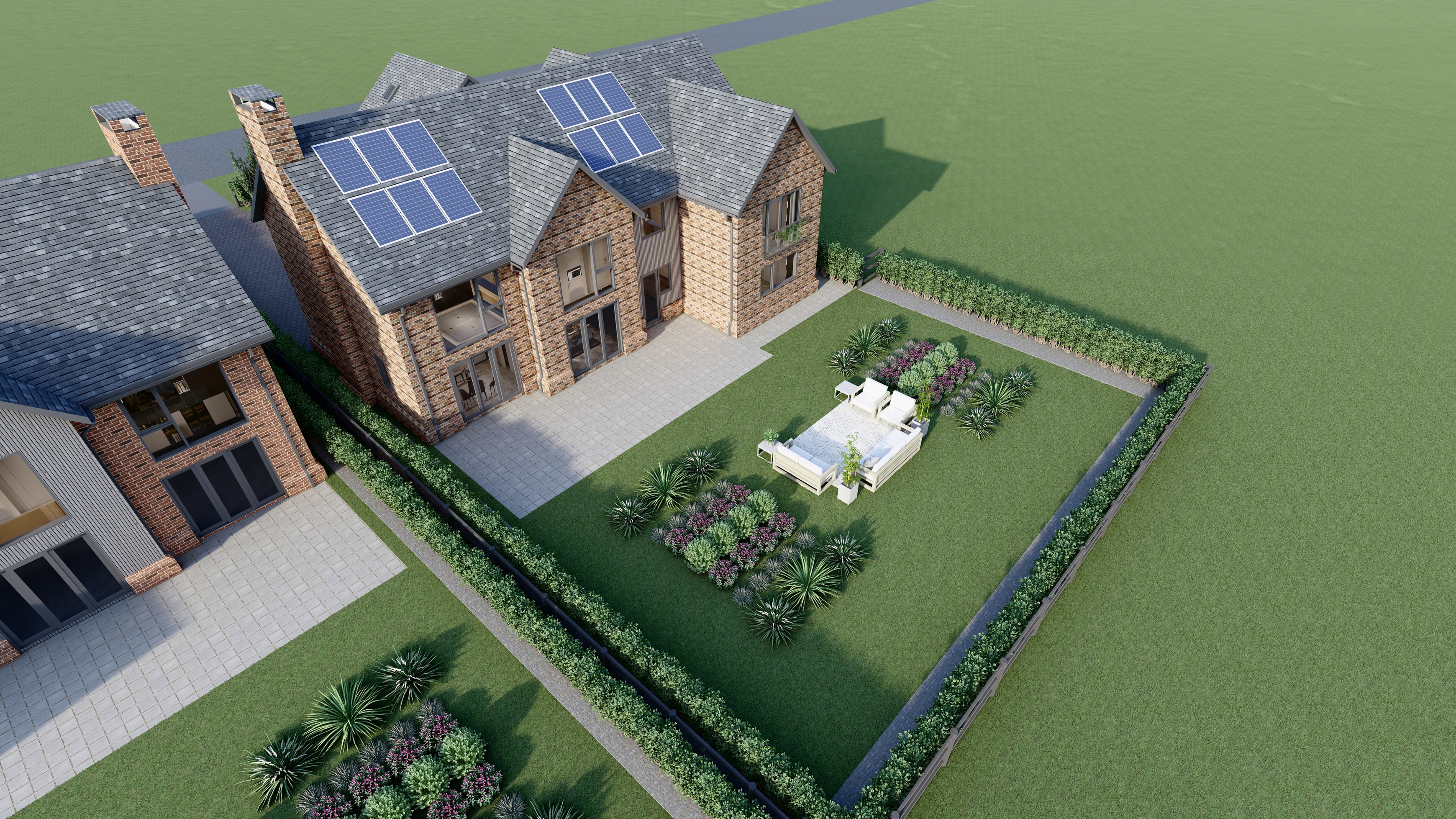 The exterior spaces will be equally impressive. The rear garden will be professionally landscaped, offering a generous lawn, garden beds and a large paved terrace designed for outdoor dining and family relaxation. To the front, a private driveway will provide ample parking and lead to the detached double garage and studio space.