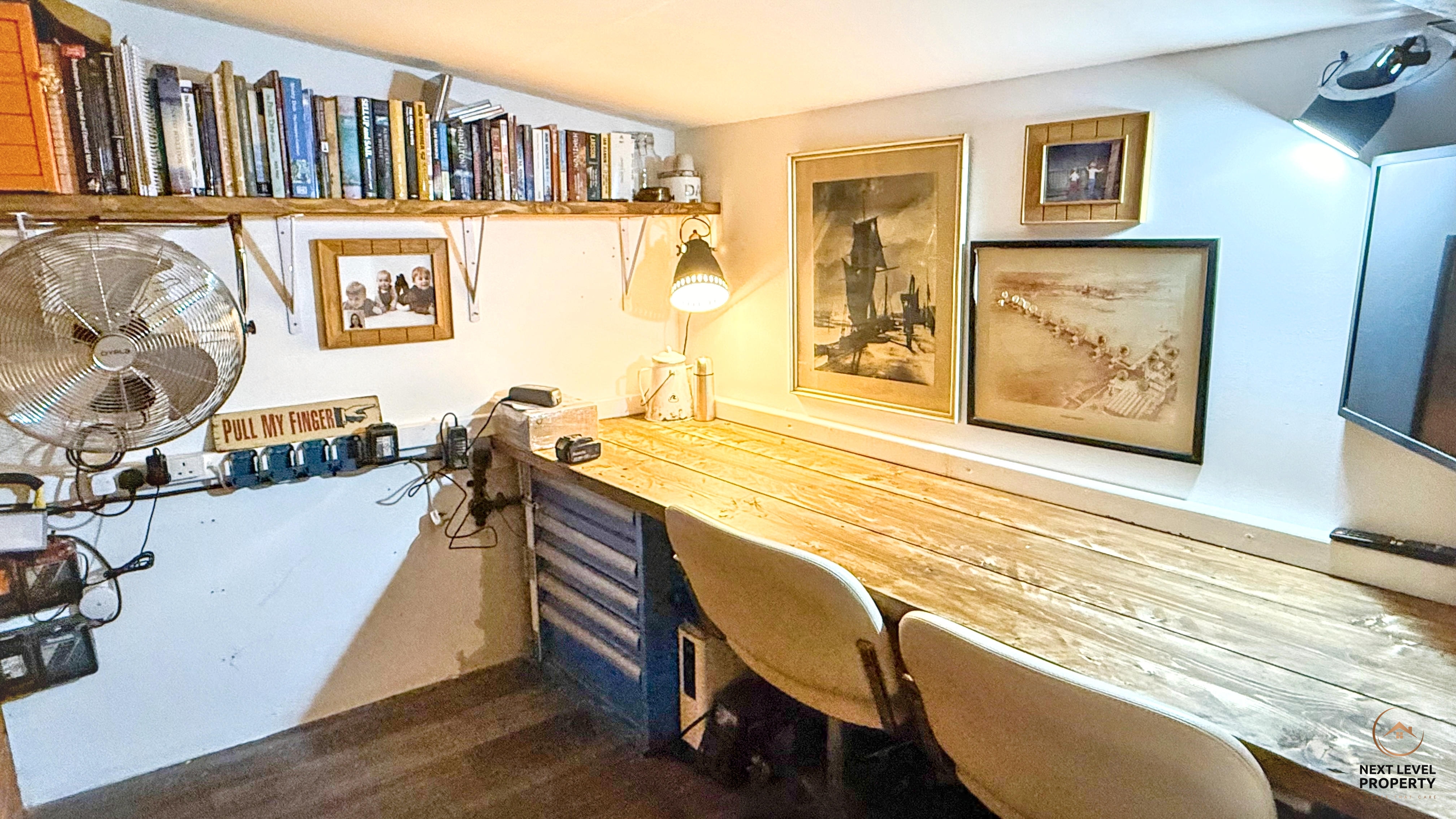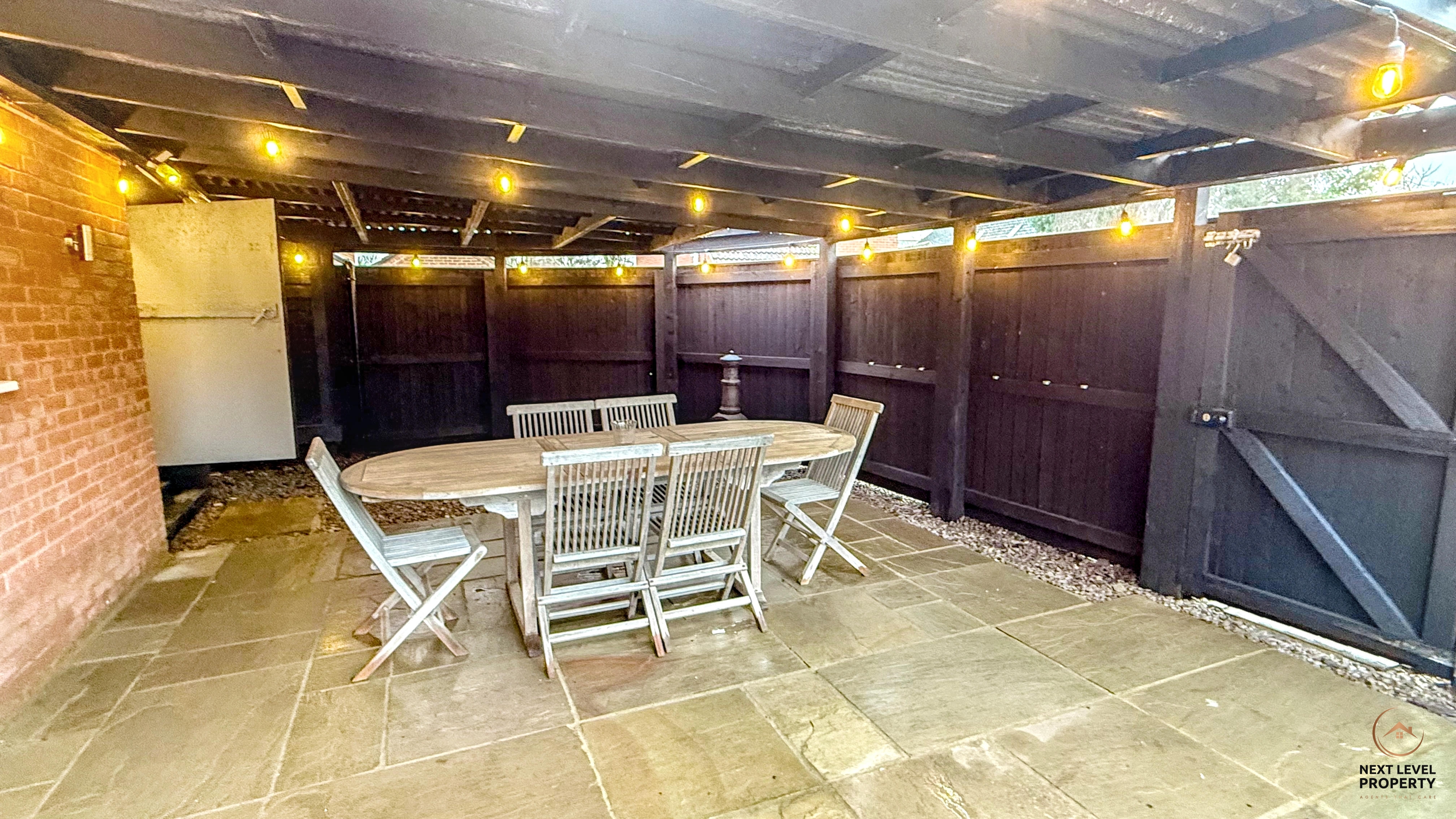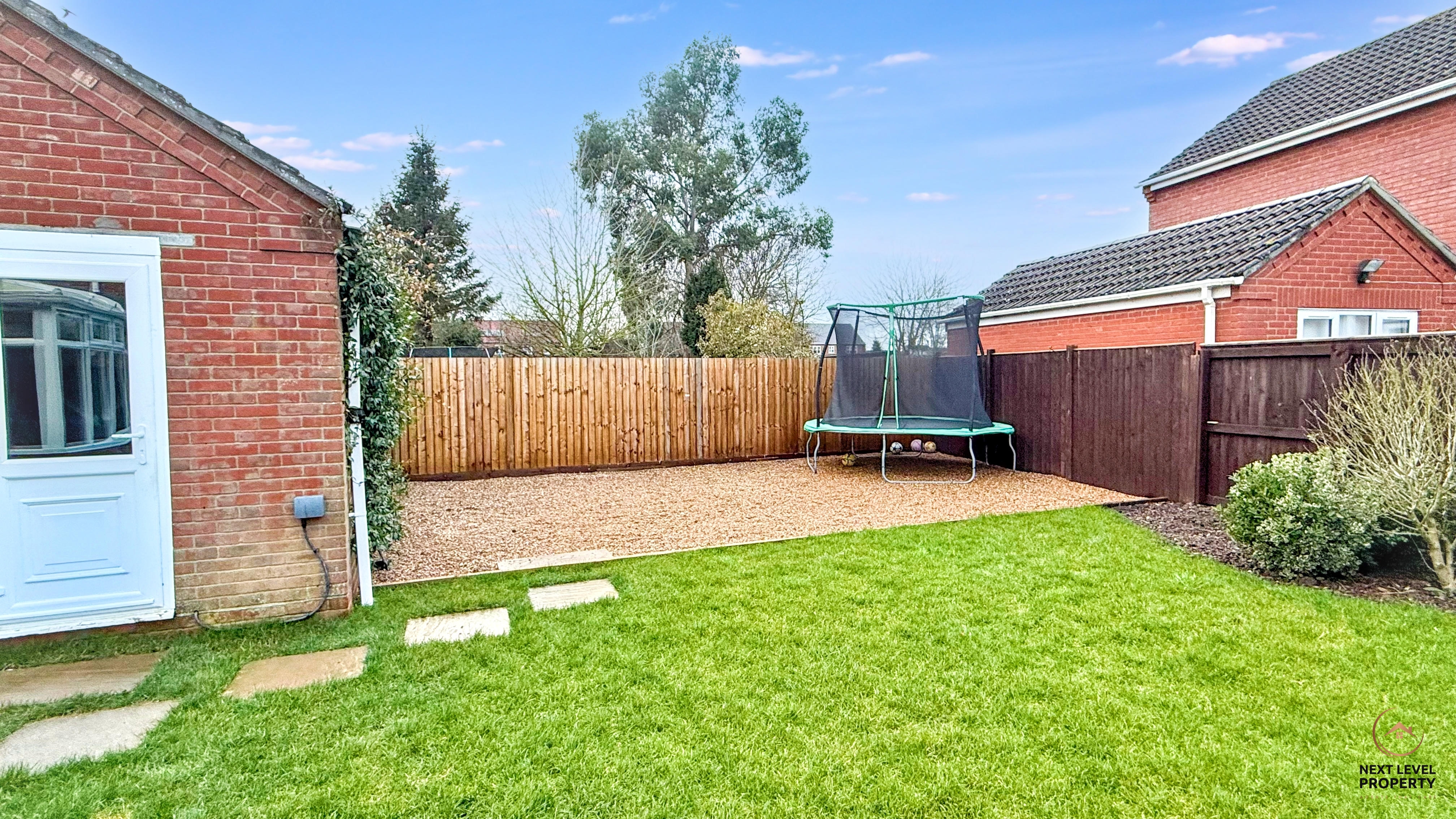 To the rear, the garden continues with a well-maintained lawn alongside a gravelled play area — ideal for a trampoline, play equipment or low-maintenance entertaining space. A covered patio/seating area with outdoor lighting creates a fantastic spot for year-round enjoyment, whether it’s summer BBQs or cosy evening gatherings. Further enhancing the versatility of the property is access to a workshop and separate office space — ideal for home working, hobbies, or those needing additional storage or business use. This is more than just a garden — it’s usable space, flexibility, parking and lifestyle all wrapped into one.
