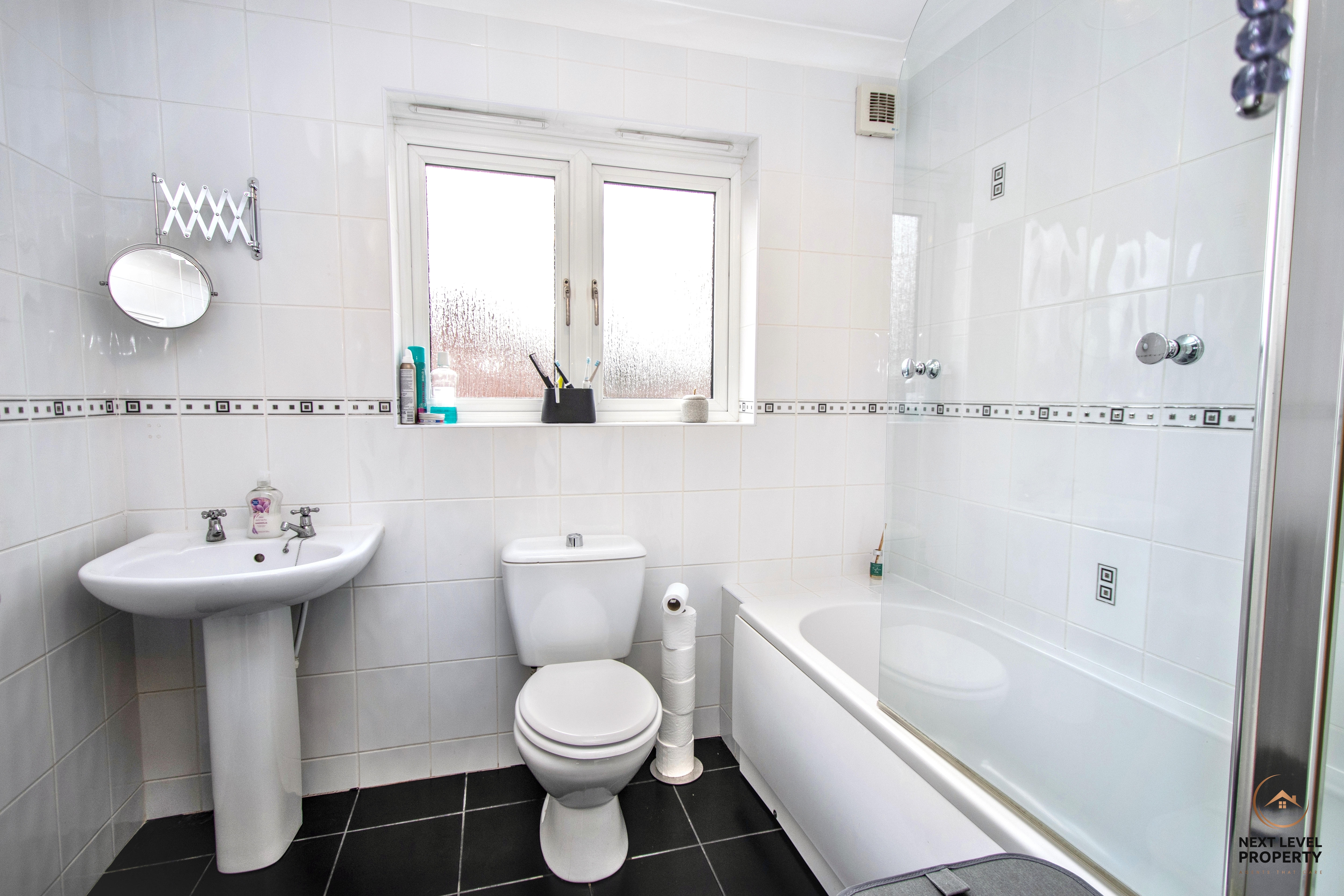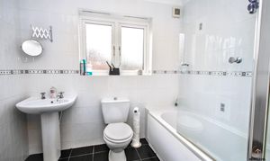 Fitted with a white suite comprising a panelled bath with shower feed over, pedestal hand basin and WC, the family bathroom offers a practical and well-presented space to serve the first floor. Fully tiled walls and flooring provide a smart, low-maintenance finish, while a uPVC window to the rear allows natural light and ventilation, keeping the room bright and fresh. A functional and neatly finished bathroom that complements the recently upgraded en-suite perfectly.