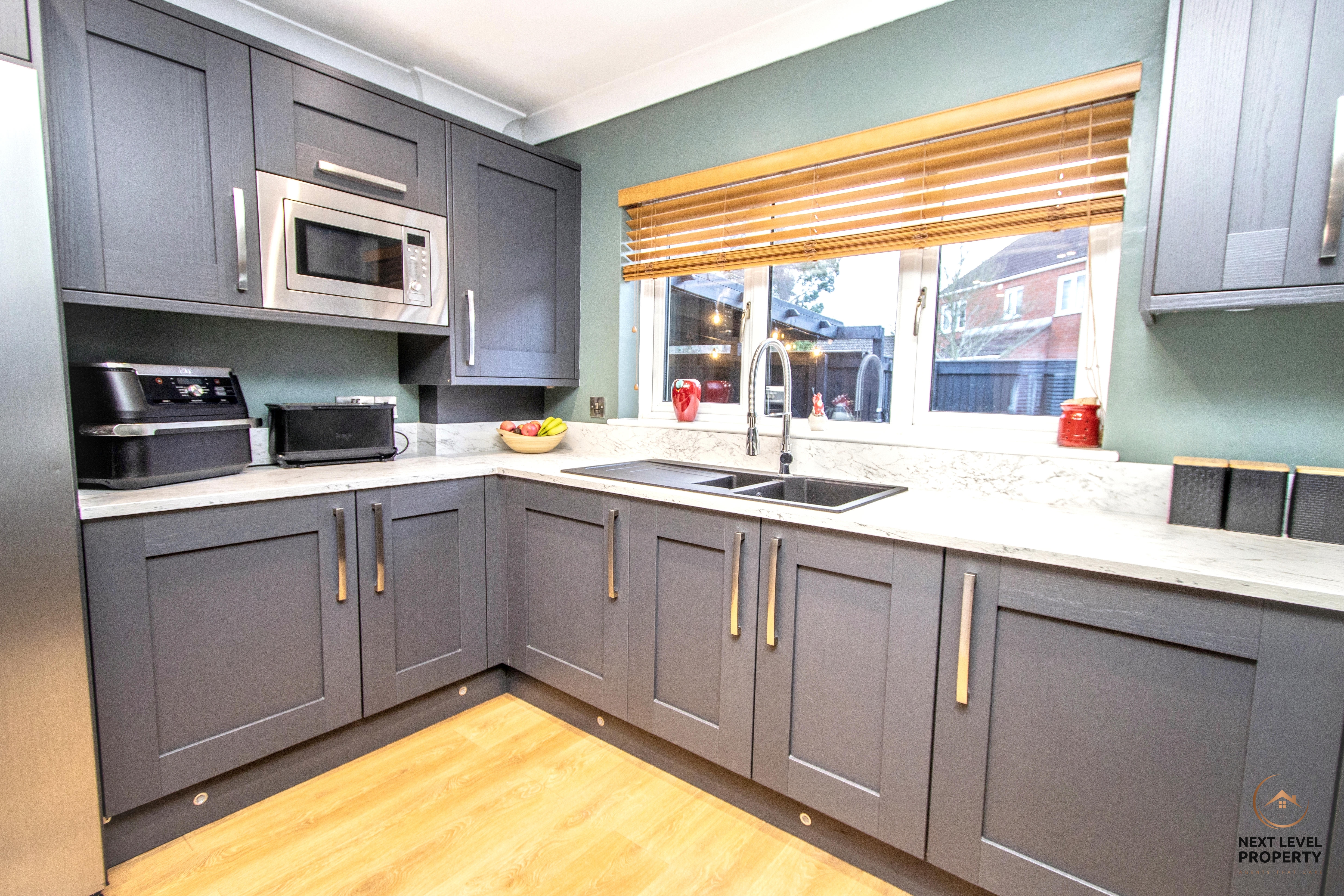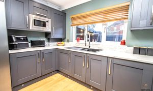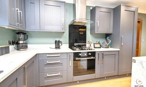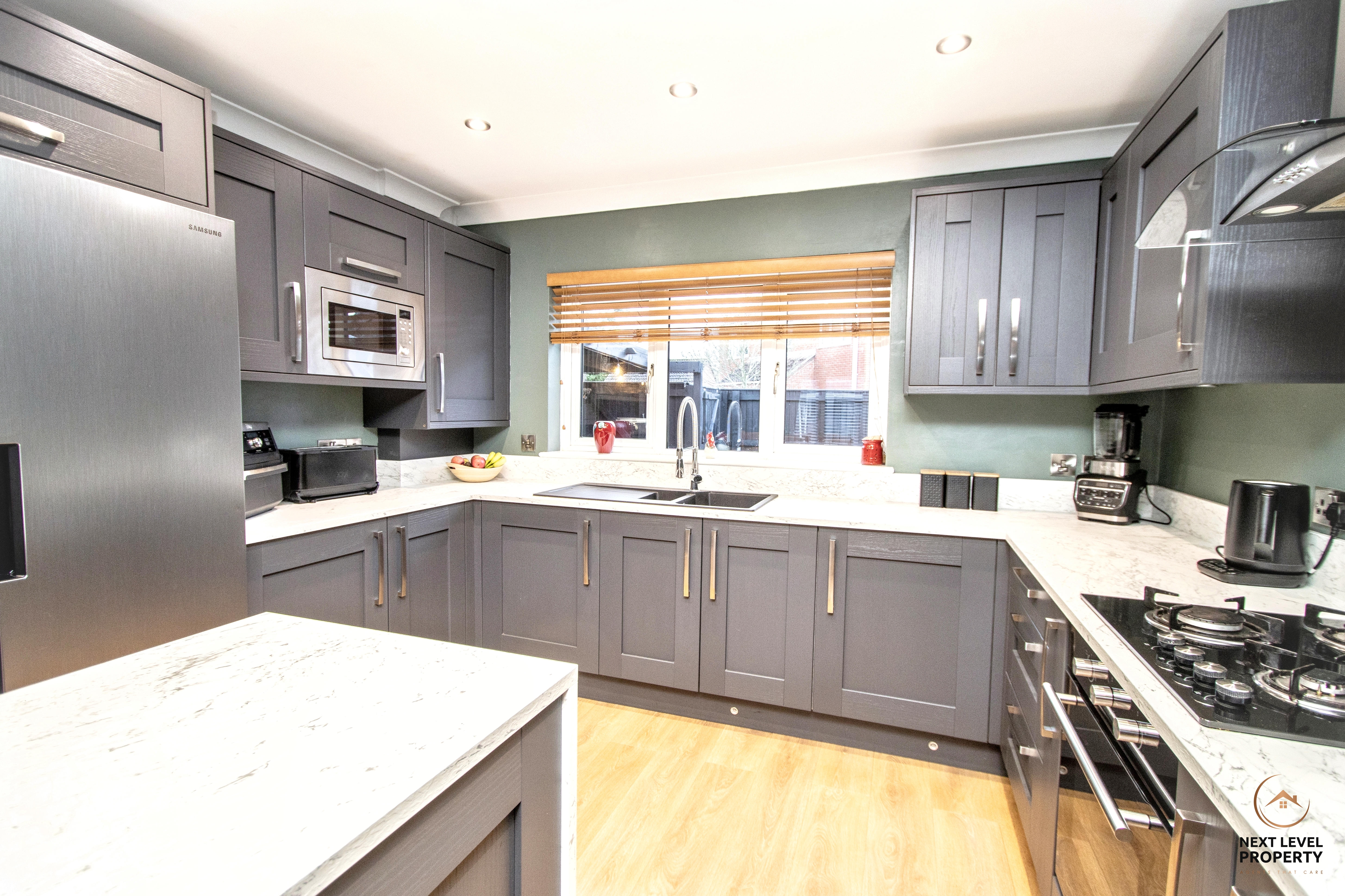 A stunning open-plan kitchen/diner that effortlessly flows through into the adjoining family room, creating a superb sociable space at the heart of the home. Designed with both style and practicality in mind, the modern grey fitted kitchen is beautifully complemented by light-coloured worktops and a central island, perfect for casual dining, morning coffee or gathering with friends while cooking. Integrated appliances include a built-in oven, gas hob with sleek black glass splashback, extractor hood, and microwave, along with dedicated space for an American-style fridge freezer. A black inset sink with a contemporary spring-neck mixer tap adds a striking, modern touch. Finished with oak-effect laminate flooring and enjoying natural light from uPVC windows to both the front and rear, this is a bright, functional and visually impressive space that truly delivers on modern family living.