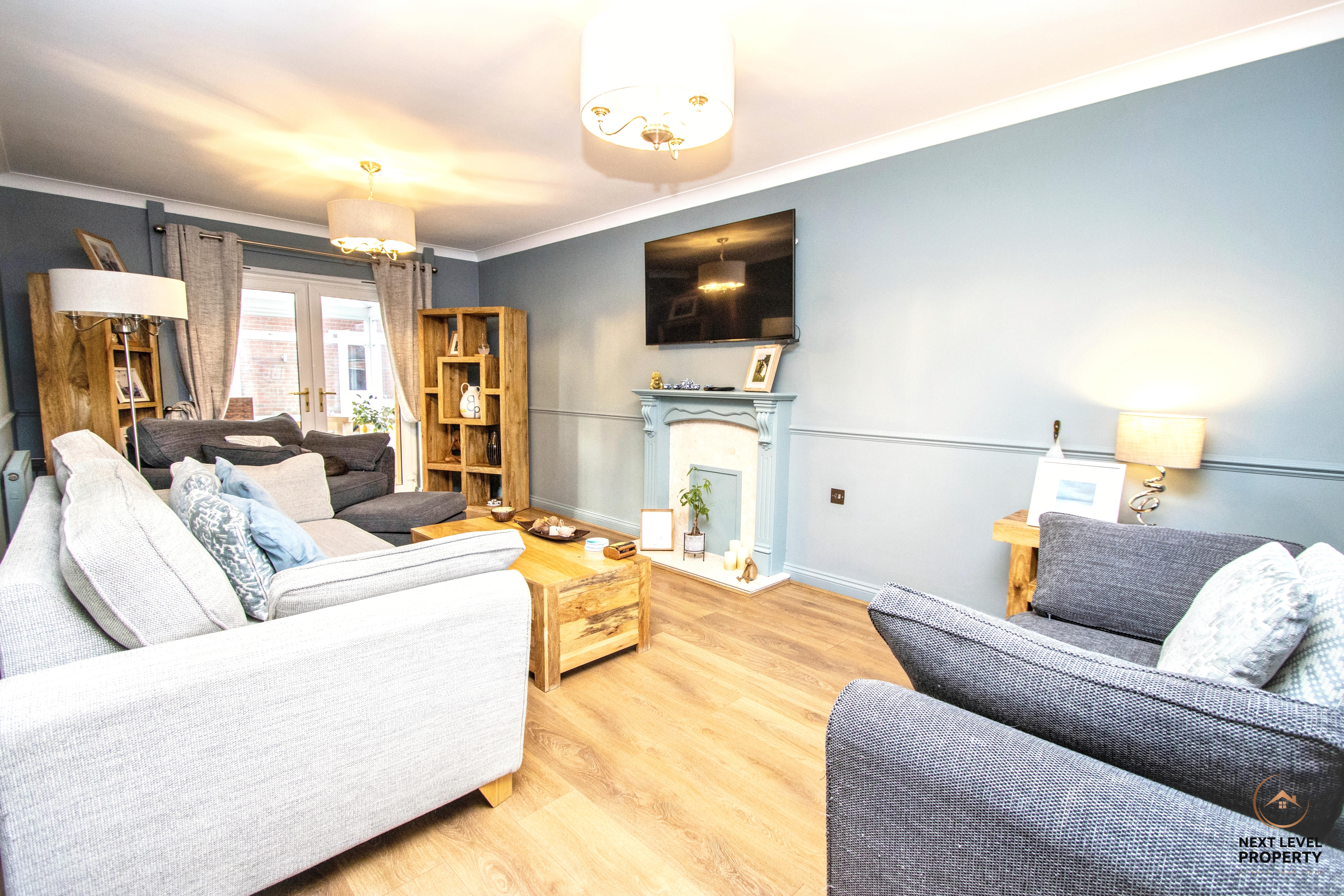 The welcoming entrance hallway, finished with oak-effect laminate flooring and oak internal doors, sets the tone for the quality throughout. To the front, the lounge provides a comfortable retreat with feature fireplace incorporating a wood surround and marble hearth, while French doors open into the conservatory, a bright garden-facing space with direct access to the patio.