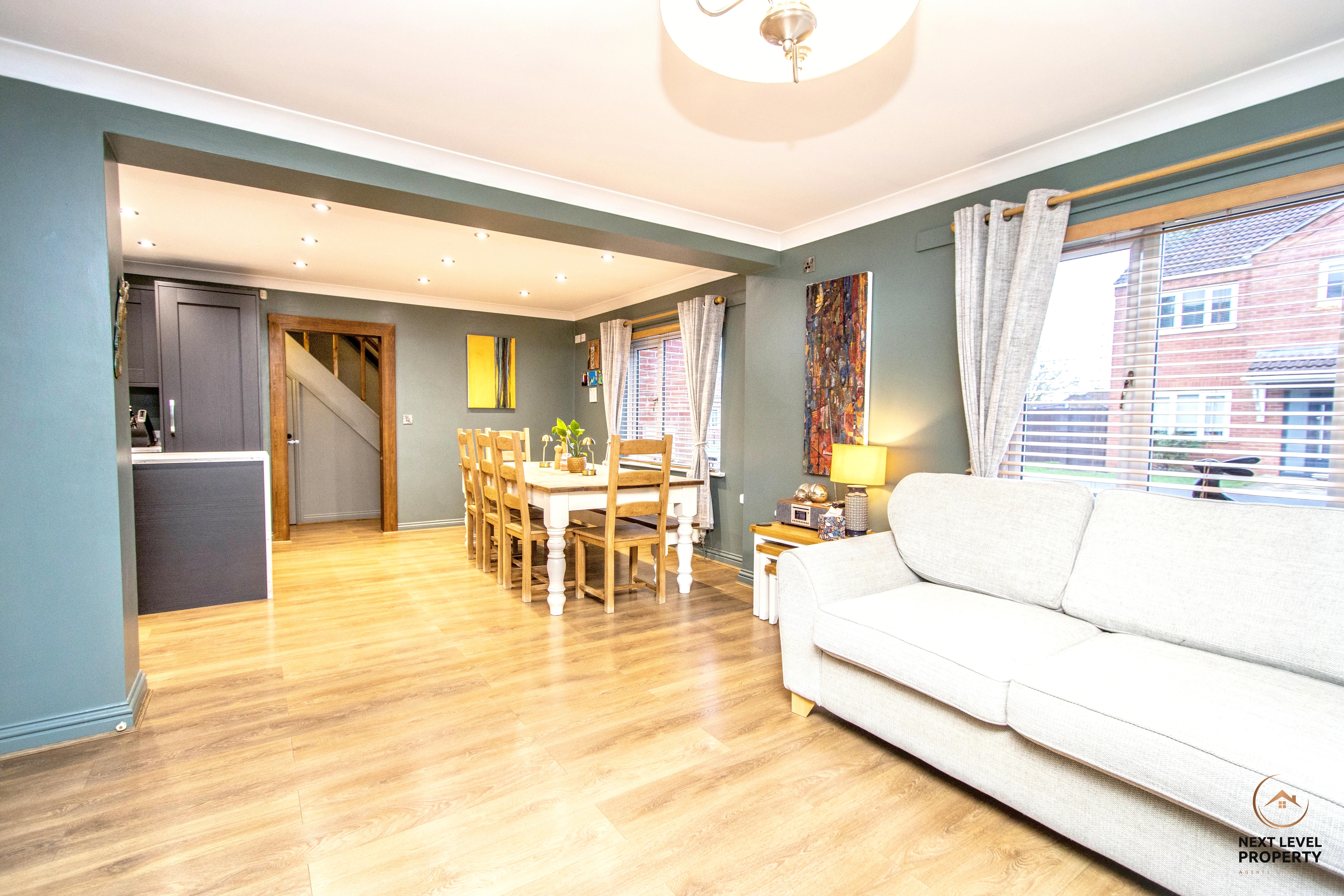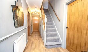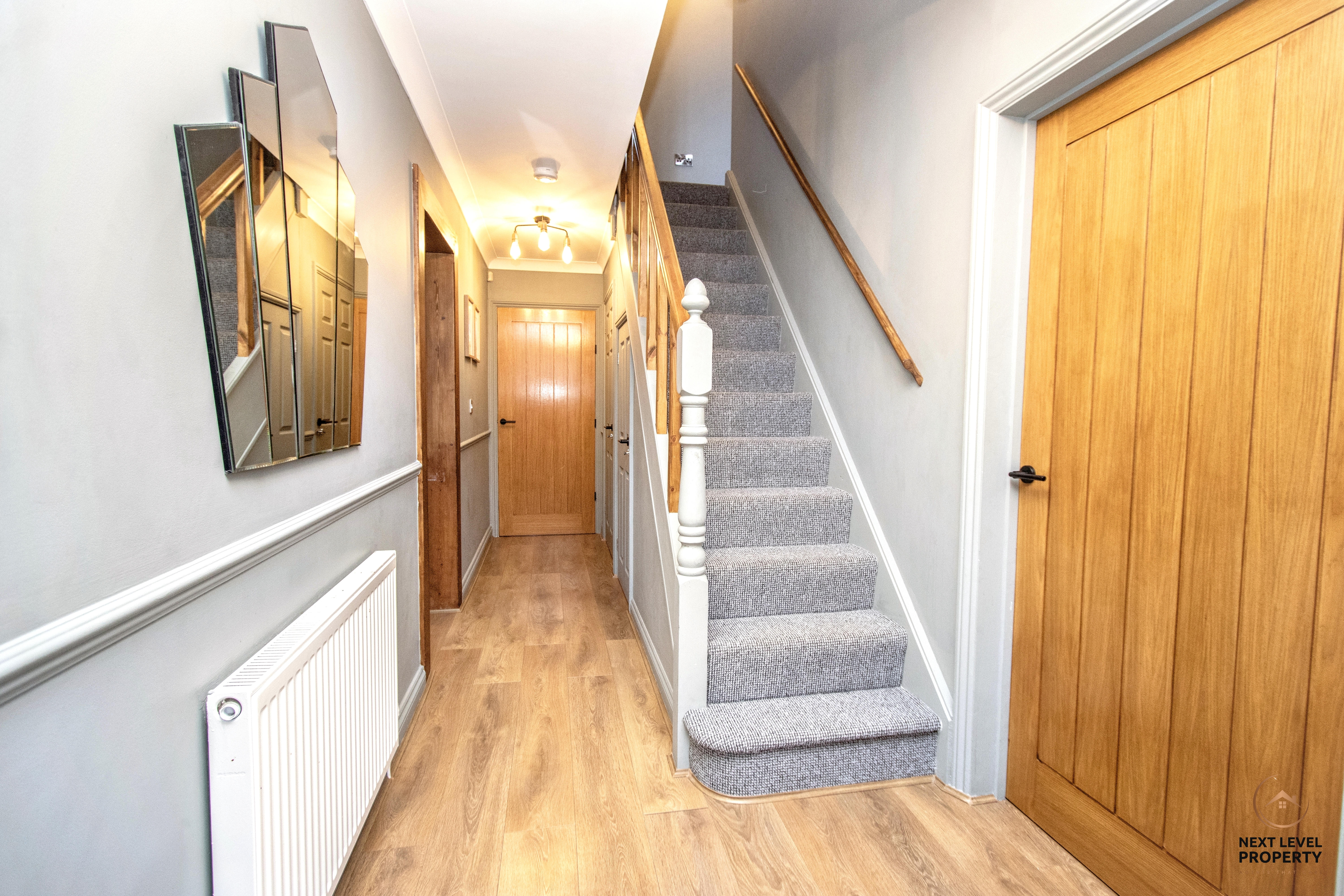 A welcoming entrance hallway that immediately gives a sense of warmth and quality, finished with stylish oak-effect laminate flooring that flows beautifully underfoot. A staircase rises to the first floor, while solid oak internal doors lead through to the lounge, kitchen/diner and ground floor cloakroom — adding a smart, cohesive feel throughout the ground floor. It’s a bright and practical introduction to the home, setting the standard for what follows.