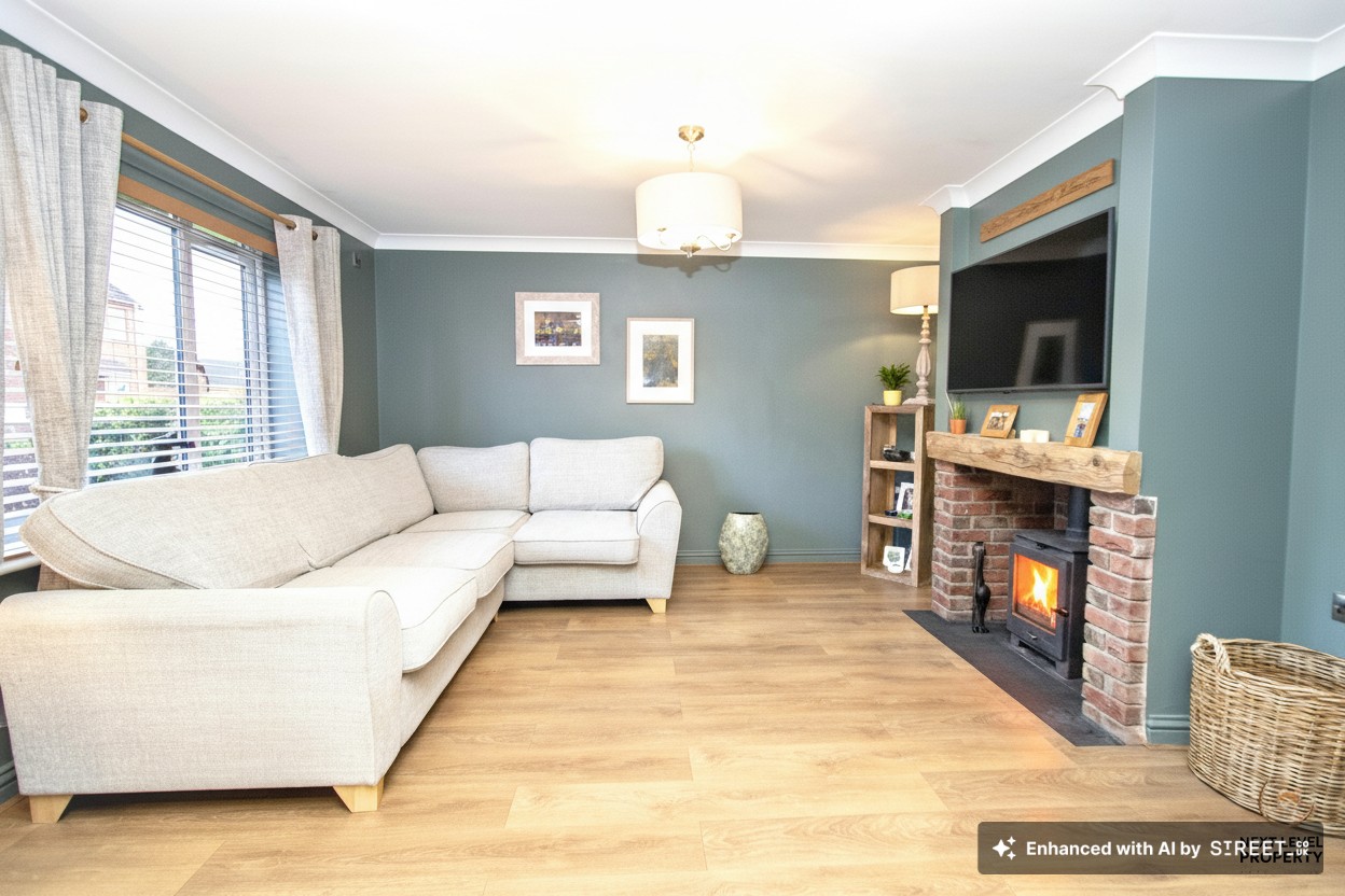 Flowing seamlessly from the kitchen/diner, the family room completes this impressive open-plan arrangement, creating a space that feels both sociable and wonderfully cosy. A feature fireplace with oak mantle, brick surround and a fitted wood burner provides a striking focal point and instantly adds warmth and character, the perfect spot to unwind on cooler evenings. Oak-effect laminate flooring continues through, maintaining the cohesive feel of the ground floor, while a uPVC window to the front ensures the room remains bright and inviting. A door leads conveniently through to the utility room, keeping the practical elements tucked away from the main living space. This is a fantastic everyday living area, ideal for families who want open-plan interaction without losing that snug, homely atmosphere.