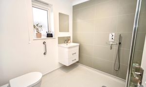 Recently re-fitted to a high standard, this contemporary en-suite wet room offers both style and practicality. Fully tiled walls and a non-slip floor with integrated floor drain create a sleek, low-maintenance finish, ideal for modern living. A mains-fed shower with rainfall shower head provides a luxurious feel, while a hand basin set within a wall-mounted storage unit keeps the space clean and uncluttered. The WC features a concealed cistern for a streamlined look, and a wall mirror enhances the sense of light. A uPVC window to the front allows natural ventilation and brightness. A superbly finished en-suite that combines comfort, accessibility and modern design — a real bonus to the main bedroom.