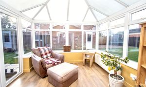Constructed in uPVC with a solid brick base, this bright and airy conservatory provides a fantastic extension to the main living space. Surrounded by window openings, it enjoys lovely natural light throughout the day and offers a pleasant outlook over the garden. Oak-effect laminate flooring continues through, creating a seamless connection from the lounge and giving the space a cohesive feel. uPVC French doors open directly onto the garden patio, making it perfect for summer entertaining or simply enjoying that easy indoor-outdoor lifestyle. A versatile addition that works beautifully as a second sitting area, garden room or relaxed dining space.