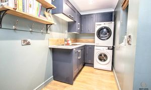 Accessed from the family room, the utility continues the quality finish with matching units that complement the kitchen, keeping the overall look consistent and well thought out. An inset sink with mixer taps provides additional practicality, while there is dedicated space for both a washing machine and tumble dryer, ideal for keeping the main kitchen clutter-free. Oak-effect laminate flooring flows through into this space, maintaining that seamless ground floor finish. A uPVC window allows natural light in, and a rear door provides direct access to the garden, perfect for muddy boots, pets or busy family life. A practical yet stylish addition that supports modern living without compromising on presentation.