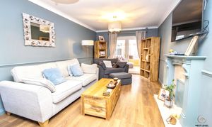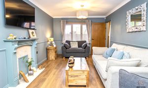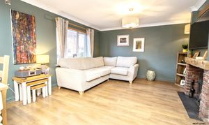 A beautifully presented lounge featuring a continuation of the oak-effect laminate flooring, creating a seamless flow from the hallway and enhancing the sense of space. A feature fireplace with wood surround and marble hearth forms an attractive focal point, perfect for arranging furniture around and creating a cosy atmosphere during the cooler months. A uPVC window to the front allows natural light to pour in, while French doors open directly into the conservatory, extending the living space and providing a lovely connection to the garden beyond. This is a comfortable and inviting reception room, equally suited to quiet evenings in or hosting family and friends.