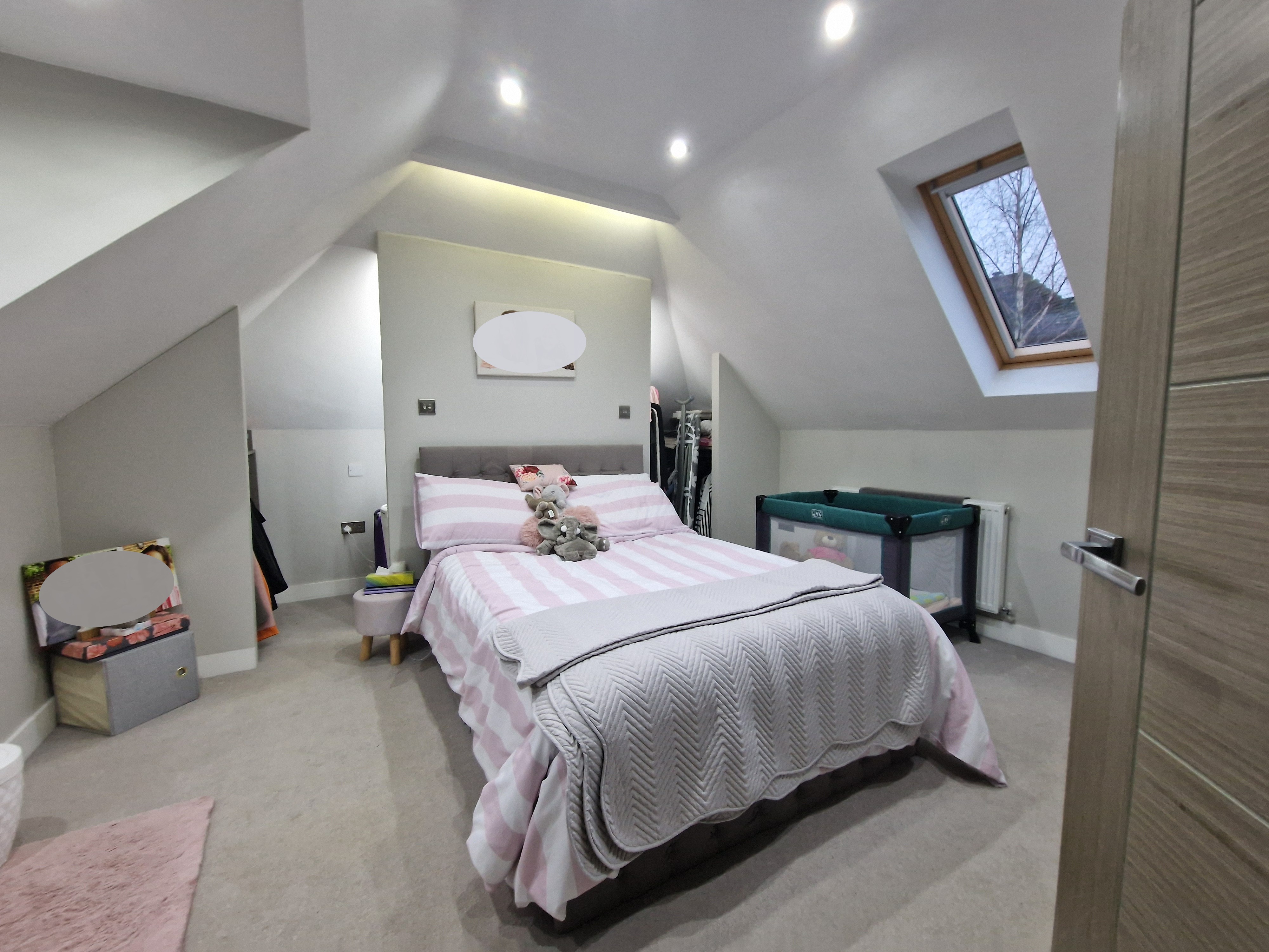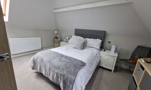 Bedroom 2: with dormer and velux double glazed windows and walk-in storage alcoves to left and right and carpet to floor. Eaves reduce the height at outer edges