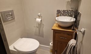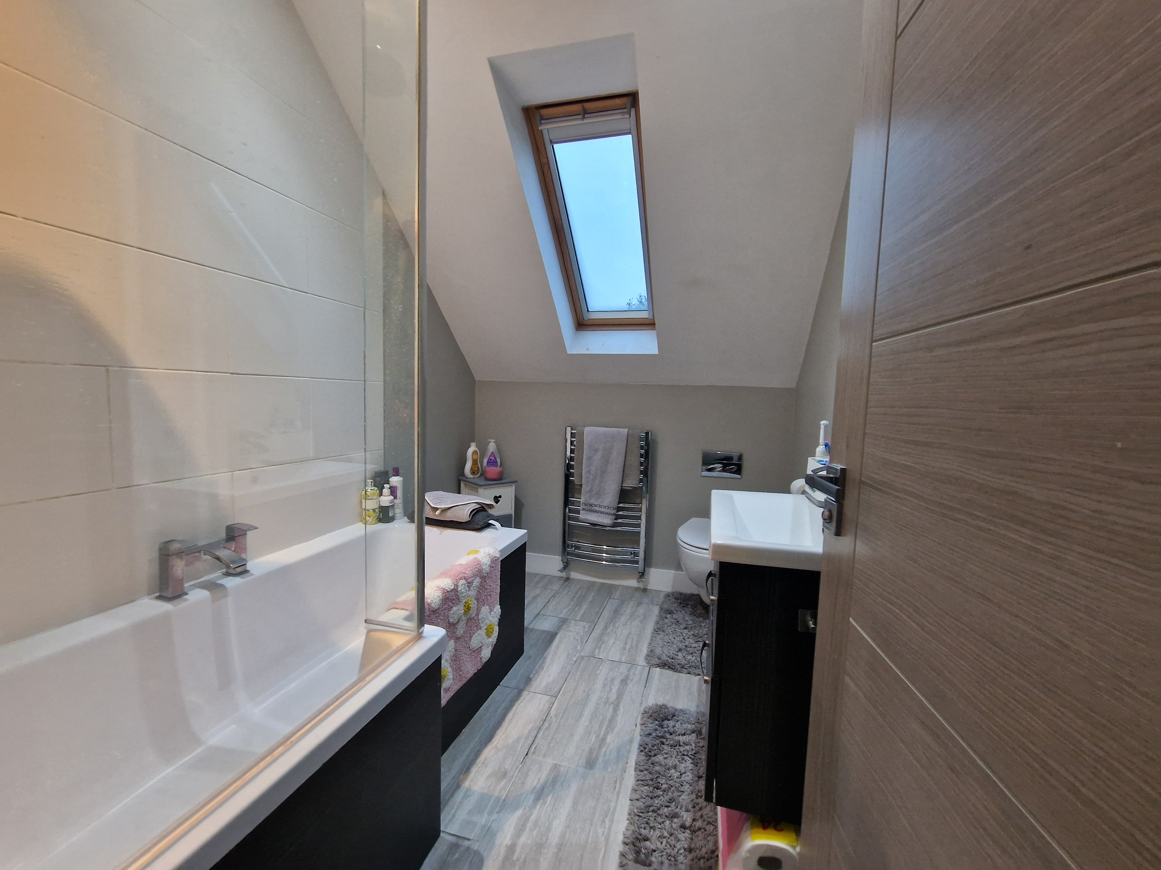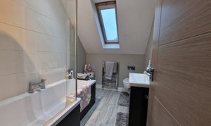 Family bathroom: with part tiled walls, tiled floor, velux window, shower over bath, washbasin with integrated cabinet, wc and heated towel rail. Eaves reduce the height at outer edge