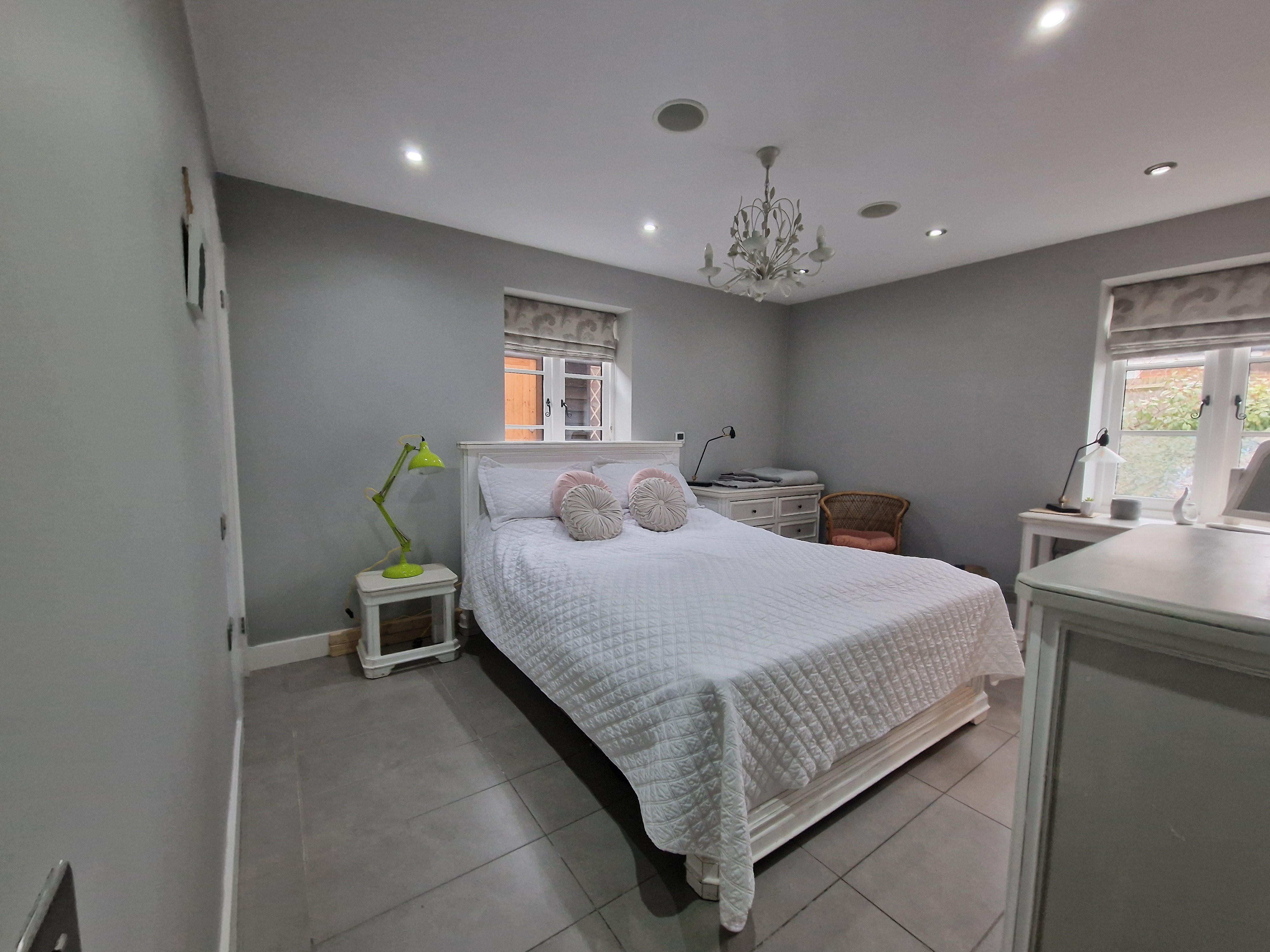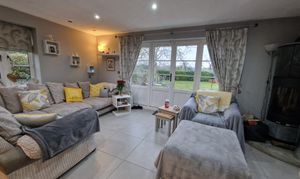 The lounge/kitchen benefits from underfloor heating, solid fuel burner, fitted kitchen units with integrated double sink, Smeg oven and hob, Smeg fridge-freezer; dishwasher; wine fridge and space for washing machine and dryer, as well as a quartz topped island unit. The lounge space has 2 sets of double glazed patio doors leading to the side and rear patio areas and three double glazed windows